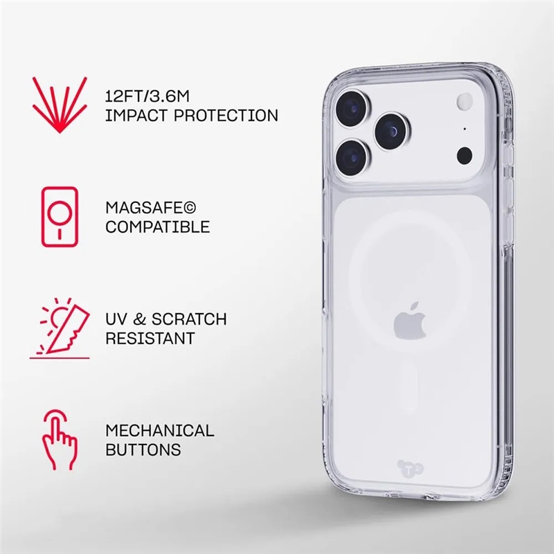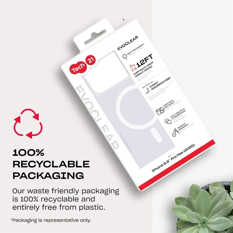 قاب آیفون ۱۷ پرو مکس Tech21 EvoClear یک محافظ نیمهسخت از جنس TPU با قابلیت ضد زرد شدن است که با دقت بالا برای مدل آیفون ۱۷ پرو مکس قالبگیری شده است. فلسفه Tech21 همواره “حفاظت مبتنی بر علم” بوده است. ویژگی بارز این برند، استفاده از مواد و فناوریهای پتنتشده جذب ضربه است که در لایههای داخلی قاب به کار میرود. این قاب برای کاربرانی ایدهآل است که به طراحی مینیمال، شفافیت بالا، تجربه کاربری روان (با دکمههای عالی) و سازگاری کامل با MagSafe اهمیت میدهند و در عین حال به پشتوانه علمی یک برند معتبر اعتماد دارند.