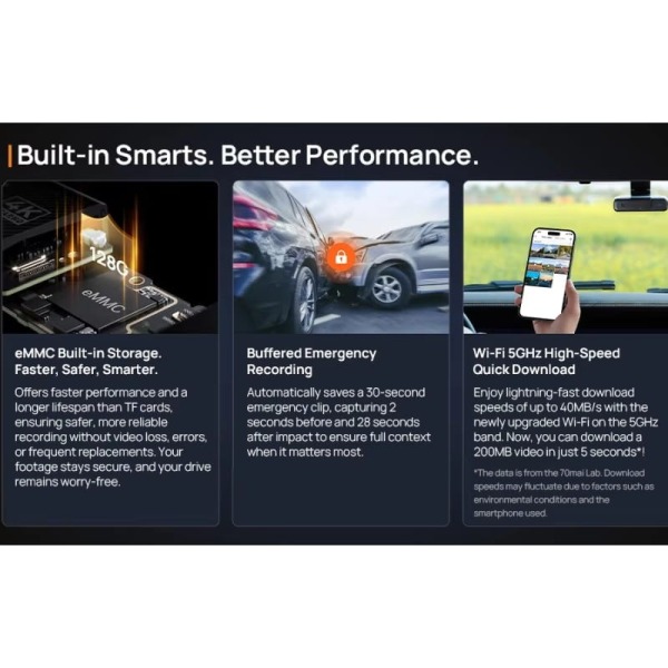 دوربین فیلم برداری خودرو Xiaomi 70mai M800 Set دارای حافظه داخلی 128 گیگابایتی از نوع eMMC است و نیازی به استفاده از کارت حافظه جداگانه ندارد. این نوع حافظه نسبت به کارتهای SD معمولی سرعت بالاتر و دوام بیشتری دارد و از بروز خطاهای ضبط یا از دست رفتن فایلها جلوگیری میکند. نتیجه این ویژگی، ضبط پایدار و بدون وقفه تصاویر در طول مسیر است.