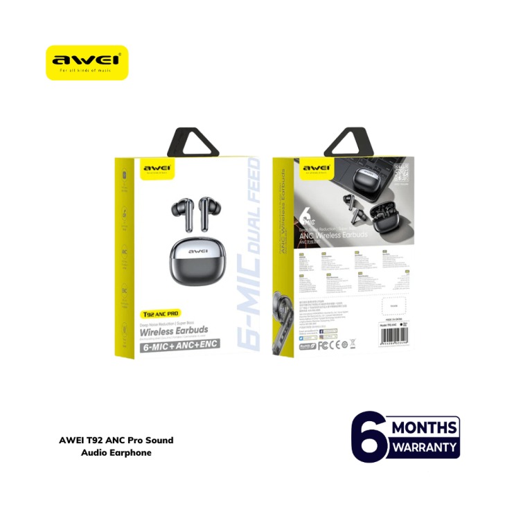 هندزفری Awei T92 ANC Pro مجهز به سیستم شش میکروفونه هیبریدی ANC و ENC است که توانایی کاهش نویز محیطی تا -52 دسی‌بل را دارد. این فناوری با تحلیل و پردازش صداهای اطراف، صداهای مزاحم را حذف کرده و موسیقی یا مکالمه شما را در فضایی کاملاً خالص ارائه می‌دهد. حتی در محیط‌های پر سر و صدا، می‌توانید با وضوح بالا به موسیقی گوش دهید یا تماس تلفنی برقرار کنید بدون آنکه صداهای مزاحم کیفیت تجربه شما را کاهش دهند.