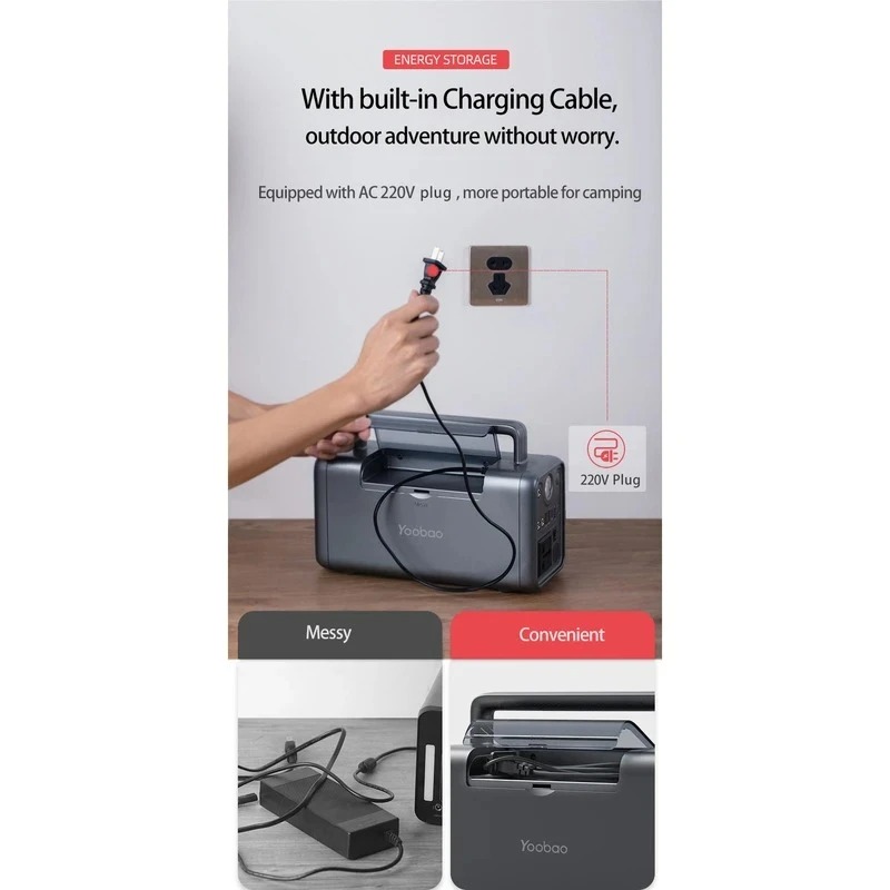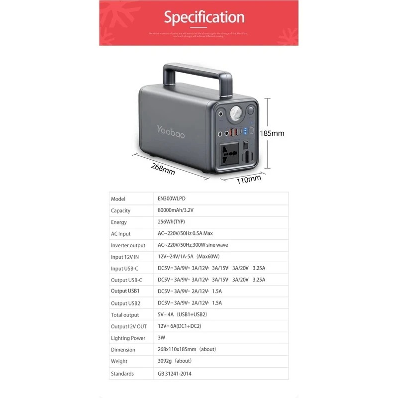 وجود یک چراغ قوه در طبیعت‌گردی‌های شبانه بسیار ضروری است . یوبائو با طراحی خلاقانه پاوربانک EN300WLPD این نیاز را هم برطرف می کند و دیگر نیازی به همراه داشتن لوازم اضافه نخواهد بود و گردشی سبک را تجربه خواهید کرد . این چراغ دارای قدرت نوری برابر با 3W است . باتری لیتیوم پر قدرت با ظرفیت 72000 میلی‌آمپرساعت در آن قرار دارد و از قابلیت شارژ سریع برخوردار است . پورت Type-C هم از فناوری شارژ سریع PD برخودار است و با قدرت 65 وات عملکردی سریع در شارژردهی دو طرفه دارد و می‌تواند نیروی مورد نیاز لپ تاپ ، مک‌بوک ، میت ‌بوک و … را هم فراهم کند . توان برق AC اینورتر یوبائو 220V است و یک نیروگاه برق اضطراری در فضای باز محسوب می‌شود. حداکثر ورودی برق DC هم معادل 60W است و می‌توان نیروی مورد نیاز انواع دستگاه‌های برقی را تامین کرد . در کنار فست شارژ بودن حفاظت‌های ایمنی چندگانه هم برای آن اعمال می شود تا از رسیدن آسیب‌های مانند تخلیه بیش از حد، حفاظت از اتصال کوتاه، شارژ بیش از حد جلوگیری شود.