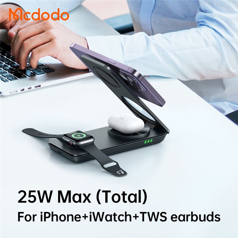 قابلت شارژ گوشی موبایل و ساعت هوشمند اپل واچ و ایرپاد به طور همزمان با حداکثر توان مجموع 25 وات و دارای قابلیت تاشو و پشتیبانی از تکنولوژی مگ سیف گوشی های اپل سری 12 به بعد