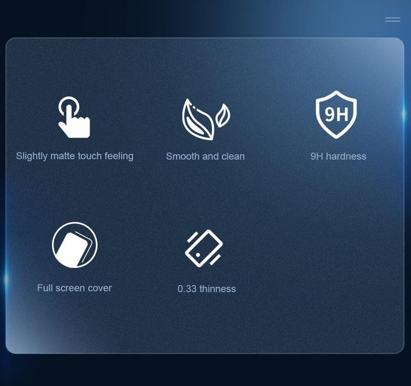 ویژگی‌ها9H, جلوگیری از انعکاس نور, جلوگیری از ایجاد خط و خش, قابلیت نصب آسان, مقاوم در برابر چربی و اثرانگشت, مقاوم در برابر خط و خش, نصب بدون حباب