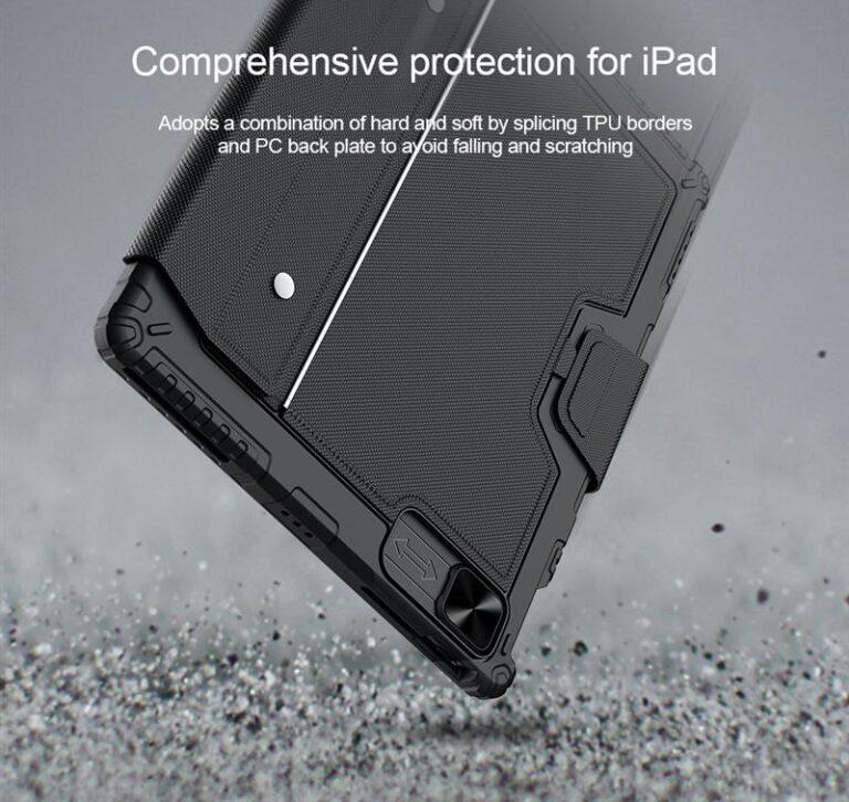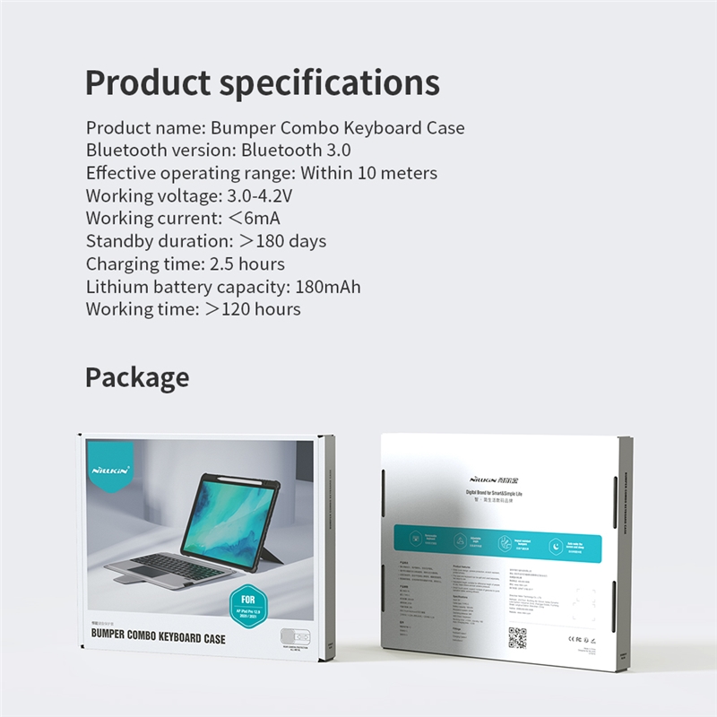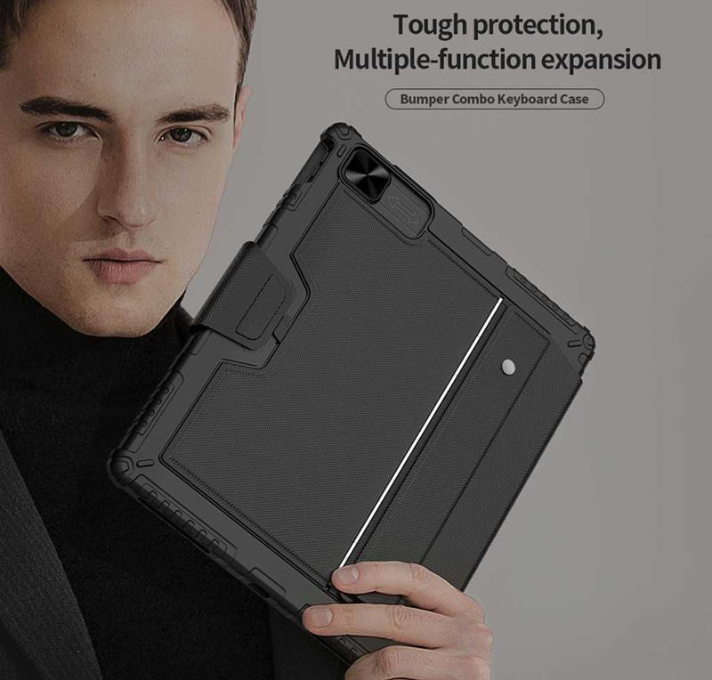 کیف کلاسوری نیلکین مدل New Bumper Combo Keyboard یکی از مهم ترین و کاربردی ترین لوازم جانبی است که شما در کنار iPad خود باید تهیه کنید تا تجربه کاربری خود را با دستگاهتان به حداکثر برسانید. ابتدایی ترین کاری که New Bumper Combo Keyboard برای شما انجام خواهد داد محافظت کامل از تمام قسمت های iPad به خصوص دوربین شماست. پوشش خارجی که ترکیبی با کیفیت از پلی کربنات PC و TPU است و نسبت به نسخه قبلی خود ارتقا یافته است iPad شما را در برابر هرگونه ضربات احتمالی و خط و خش ناشی از برخورد با اشیا تیز حفظ میکند. داشتن چنین کیف محافظی در وهله اول با توجه به ارزش بالای دستگاه شما یک امر غیر قابل چشم پوشی است. قابلیت دیگر قابل ملاحظه این است که این قاب برای شما در زاویه 110 تا 180 درجه به صورت استند در میآید تا بتوایند به سادگی هرچه تمام تر به مشاهده فیلم و سریال و یا انجام طراحی و مطالعه کتاب یا مقالات الکترونیکی خود بپردازید بدون آنکه نگران سر خوردن دستگاه باشید. در چهار گوشه این قاب برآمدگی هایی ایجاد شده است تا در صورت سقوط دستگاه ورود ضربه به دستگاه را به حداقل برساند. یکی از مهم ترین ویژگی های این کیف کلاسوری داشتن یک کیبورد بی سیم با بورد 10 متری است که طراحی آن نسبت به نسخه قبلی خود بهینه تر شده است و دکمه های کیبورد طوری طراحی شده اند که بسیار نرم و بدون ایجاد لغزندگی در هنگام تایپ هستند و کمترین صدای ممکن را در هنگم تایپ ایجاد میکنند. دکمه های میانبر آن نیز نسبت به مدل قبلی بهینه تر شده و دارای تغییراتی شده اند. یک باتری 180 میلی آمپر ساعتی لیتیومی در آن بکار رفته است که تنها با 2.5 ساعت شارژ طی تست ها با حدود روزی 2 ساعت کارکرد تا 55 روز برای کاربر کارایی خواهد داشت، پس نگران اتمام شارژ آن در هنگام سفر و یا محیط های بیرون نخواهید بود. تاچ پد روی کیبورد نیز با قابلیت های مختلفی طراحی شده است و همچنین گزینه ای طراحی شده تا بتوانید آنره قفل کنید تا اگر به صورت تصادفی انرا لمس کردید به مشکلی نخورید. نسخه بلوتوث این کیبورد 3.0 است پس حساسیت عملکرد بالایی از آن خواهید دید و به صورت کلی به همراه این کیف کلاسوری فوق العاده از iPad خود میتوانید به مانند یک مک بوک کامل استفاده نمایید. در قسمت جلویی قاب نیز محلی برای قرار دادن قلم هوشمند اپل و شارژ آن به صورت وایرلس طراحی شده است.