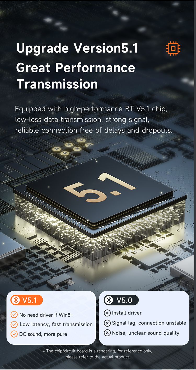 پشتیبانی از جدیدترین ورژن بلوتوث 5.1 سرعت اتصال خارق العاده با قدرت سیگنال بسیار بالا و بدون هیچ گونه تاخیر در انتقال دیتا و پایداری اتصال فوق العاده.