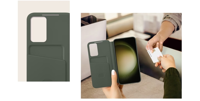 روی درب کیف هوشمند Samsung Galaxy S23 Plus Smart View Wallet Case یک جاکارتی تعبیه شده است و می توانید کارت شناسایی یا کارت بانکی خود را در آن قرار دهید.