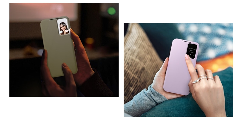روی درب کیف هوشمند Samsung Galaxy S23 Plus Smart View Wallet Case یک پنجره کوچک قرار دارد که از طریق آن می توانید بدون باز کردن درب کیف بعضی قابلیت ها را کنترل کنید. برای مثال در زمانی که تماسی دریافت می کنید بدون باز کردن کاور کیف سامسونگ S23 Plus Smart View Wallet می توانید نام و شماره تماس گیرنده را ببینید و با سوایپ کردن روی قسمت سمت راست که مشابه یک مانیتور است، به تماس پاسخ دهید یا رد تماس کنید. همچنین امکان انتخاب تصاویر پشت زمینه را برای آن دارید. با فعال بودن صفحه نمایش همیشه روشن (Always On Display)، این قابلیت در پنجره کوچک نیز به نمایش در خواهد آمد.