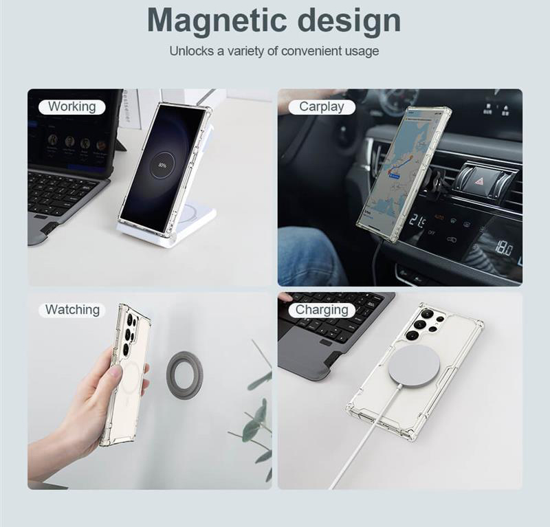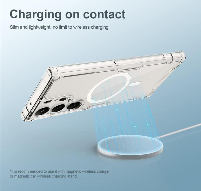 بدنه‌ی زیبا و جذاب موبایل‌تان به پوششی دقیق و بی‌نقص نیاز دارد.برخورد هر شی نوک تیز و هر خراش جزئی می‌تواند ظاهر براق آن را از بین ببرد.هر بار لیز خوردن گوشی از دست‌تان می‌تواند برابر با ضرری چند میلیونی باشد.پس باید از قابی مطمئن برای محافظت از آن استفاده کنید.قابی که امنیت تمام قسمت‌های حساس گوشی را فراهم کند.خبر خوب اینکه قاب جدید نیلکین همه‌ی این ویژگی‌ها را دارد.کاور نیلکین مدل Nature TPU Pro Magnetic خیال‌تان را از هر نظر راحت می‌کند.با مشاهده‌ کارایی و قابلیت‌های ویژه‌ی این قاب شگفت زده خواهید شد.تفاوت این قاب با نسخه معمولی در ساپورت کردن شارژر وایرلس شارژر و مگ سیف هست ،که با این قاب به راحتی میتوانید گلکسی خود را با شارژر وایرلس یا مگ سیف سریع شارژ کنید و یا به نگهدارنده آهنربایی وصل کنید.این قاب فوق العاده با فرآیند قالب‌گیری تزریقی از مواد TPU و PC ساخته شده است.ترکیب دو متریال سخت و نرم محافظت بی‌نقص قاب را تضمین می‌کند.ضخامت نازک این قاب هیچ مانعی برای شارژ وایرلس گوشی ایجاد نخواهد کرد.پس برای شارژ گوشی نیازی به جدا کردن قاب ندارید.قاب با پوشش ضخیم در لبه‌های ال سی دی محافظتی همه جانبه ارائه می‌دهد و از خراشیدگی و آسیب ناشی از ضربه جلوگیری می‌کند.کاور در قسمت پورت‌ها، حسگرها و دوربین‌ها بطور دقیقی برش خورده‌ تا برای استفاده از این قسمت‌ها نیازی به جدا کردن قاب نباشد.این قاب دارای کیسه‌های هوا در گوشه‌های قاب میباشد که اثر ضربه را کاهش داده و مانع انتقال فشار آن به اجزای داخلی گوشی می‌شوند.کاور حالتی شفاف،صاف،نازک و ابریشمی دارد که ظاهر موبایلتان را حفظ کرده و به آن جلوه‌ی براقی می‌دهد.انعطاف بالای این قاب به دفع موثر ضربه‌ها کمک کرده و نصب و جداسازی آن را به آسانی امکان‌پذیر می‌‌کند.کاور نیلکین مدل Nature TPU Pro Magnetic،قابی خوش ساخت که متناسب با ابعاد موبایل‌تان ساخته شده و گوشی بطور کامل داخل آن فیکس می‌شود.پوشش روی کلیدها از خط‌وخش آن‌ها جلوگیری کرده و مانع نفوذ ذرات ریز گردوغبار به این قسمت‌ها می‌شود.نگران لنز دوربین‌تان نباشید، ارتفاع جزئی قاب در اطراف این قسمت مانع برخورد مستقیم ضربه خواهد شد.برخلاف قاب‌های بی‌کیفیت بدنه‌ی این قاب ضد اثر انگشت و لکه‌های چربی است و آلودگی‌ها جذب نمی‌کند.