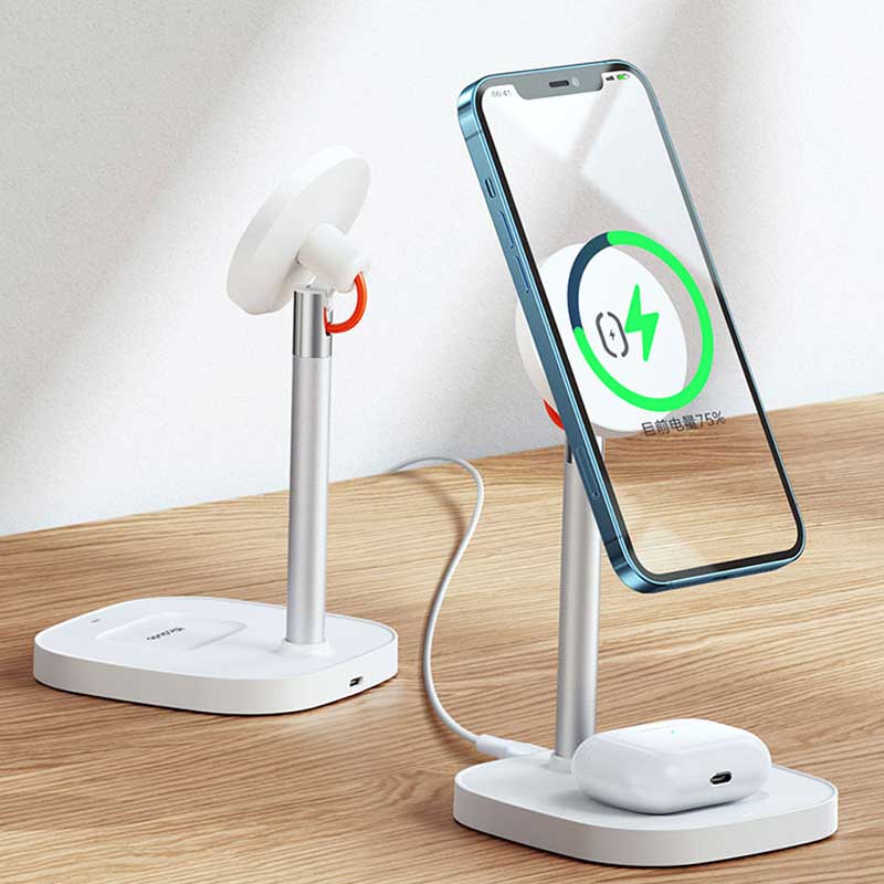نشانگر LED طراحی ساده و شبک شارژر وایرلس رومیزی گوشی های سری آیفون ۱۲ و ۱۳ شارژ همزمان گوشی آیفون و هندزفری ایرپاد