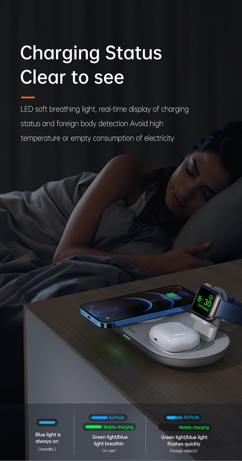 این شارژر دارای سه قسمت است. یکی برای قرار دادن گوشی هوشمند، یک پایه برای قرار دادن ساعت هوشمند و دیگری نیز برای شارژ کردن هندزفری بلوتوثی در نظر گرفته شده است.
