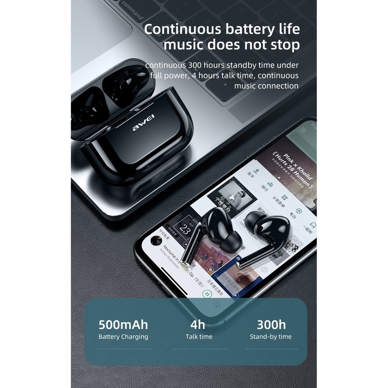 یکی دیگر از مواردی که هندزفری Awei T29 را به یک محصول خوب تبدیل کرده است طول عمر باتری آن است. ظرفیت گوشی ها 45 میلی آمپر ساعت و کیس شارژ آن 500 میلی آمپر ساعت است و شما با هندزفری Awei T29 می توانید به مدت 3.5 ساعت برای شنیدن موسیقی و 4 ساعت برای مکالمه به صورت مداوم از گوشی ها استفاده کنید. برای شارژ کیس آن به حدود 2 ساعت زمان نیاز دارید. این در حالی است که زمان آماده به کار آن به 300 ساعت می رسد.