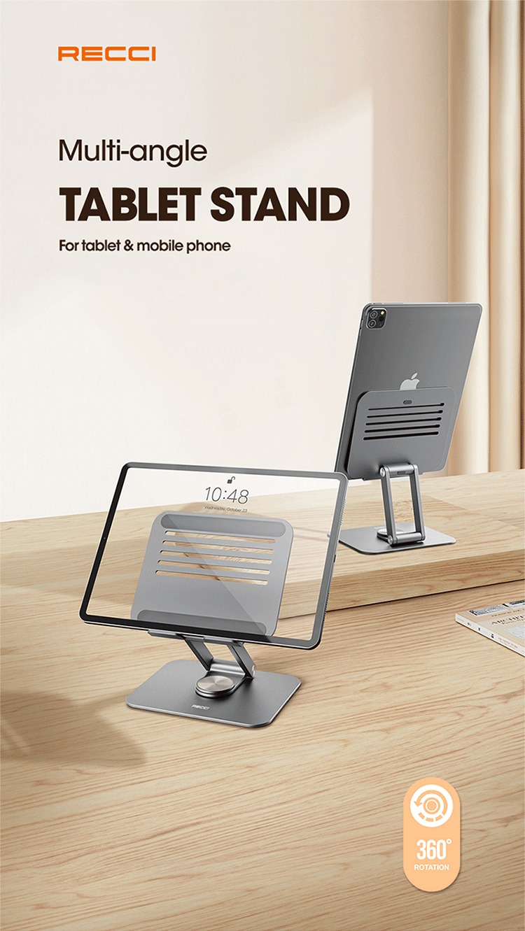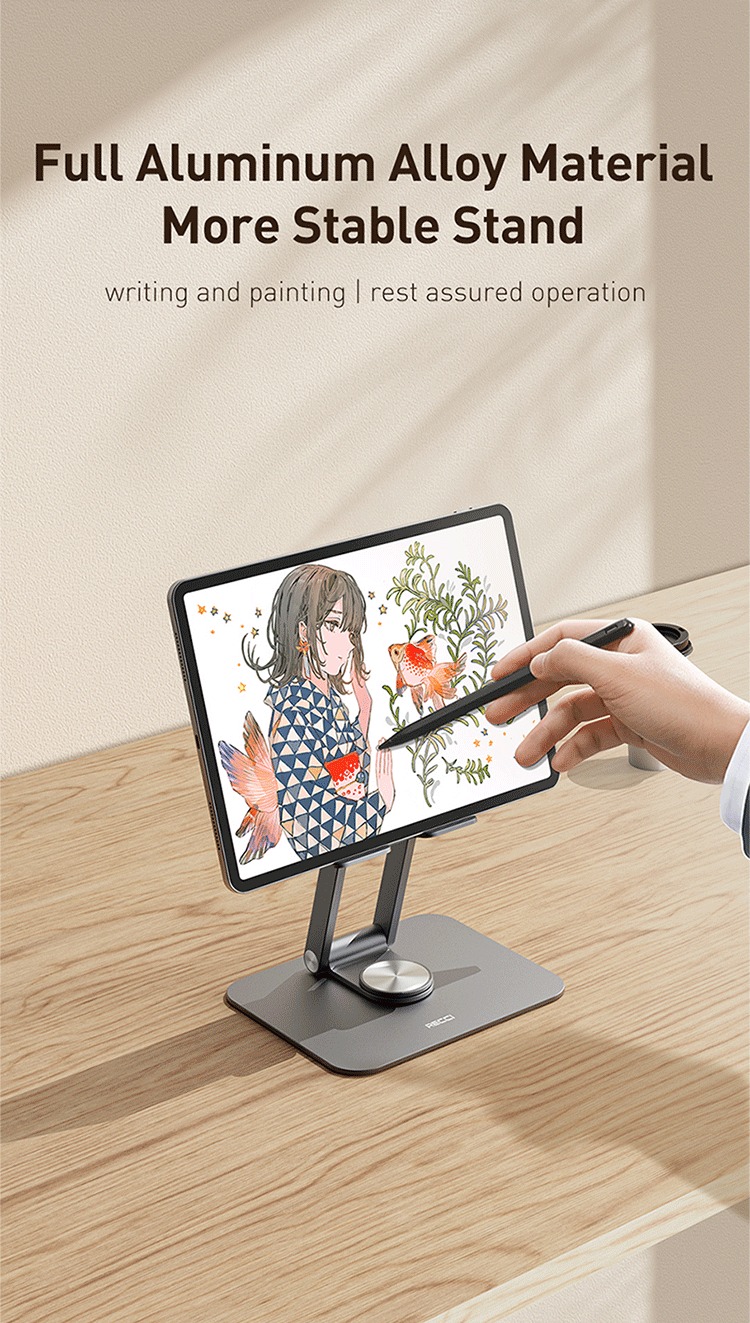 همچنین وجود پایه ضد ارتعاش که امکان گردش 360 درجه ای به هولدر رومیزی می دهد و نیز تنظیم زاویه تبلت یا آیپد از طریق 2 اتصال بازویی، آزادی عمل خیره کننده ای را ایجاد می نماید به شکلی که بازو روی محور پایین تا 360 درجه و در محور بالا تا 180 درجه آزادی گردش دارد. وزن 515 گرمی این محصول و توانایی تا شدن آن باعث سهولت در نقل و انتقال آن می گردد.