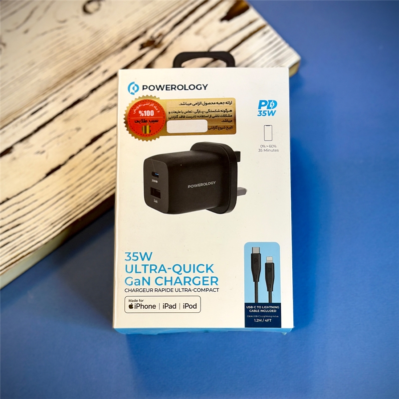 شارژر 35W پاورولوژی Powerology مدل PWCUQC005 فست شارژ به همراه کابل دارای کابل تایپ سی به لایتنینگ 1.2 متر کابل دارای تاییدیه MFI دارای تکنولوژی GaN دارای 2 خروج خروجی تایپ سی تا 20 وات خروجی USB تا 12 وات گارانتی 6 ماهه شرکتی