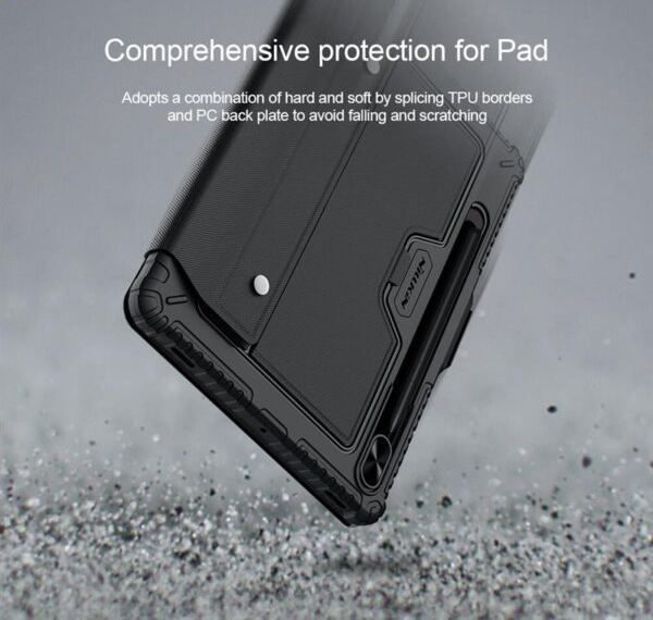 کیف کلاسوری نیلکین مدل New Bumper Combo Keyboard یکی از مهم ترین و کاربردی ترین لوازم جانبی است که شما در کنار Galaxy Tab خود باید تهیه کنید تا تجربه کاربری خود را با دستگاهتان به حداکثر برسانید. ابتدایی ترین کاری که New Bumper Combo Keyboard برای شما انجام خواهد داد محافظت کامل از تمام قسمت ها به خصوص دوربین شماست. پوشش خارجی که ترکیبی با کیفیت از پلی کربنات PC و TPU است و نسبت به نسخه قبلی خود ارتقا یافته است Galaxy Tab شما را در برابر هرگونه ضربات احتمالی و خط و خش ناشی از برخورد با اشیا تیز حفظ میکند. داشتن چنین کیف محافظی در وهله اول با توجه به ارزش بالای دستگاه شما یک امر غیر قابل چشم پوشی است. قابلیت دیگر قابل ملاحظه این است که این قاب برای شما در زاویه 110 تا 180 درجه به صورت استند در میآید تا بتوایند به سادگی هرچه تمام تر به مشاهده فیلم و سریال و یا انجام طراحی و مطالعه کتاب یا مقالات الکترونیکی خود بپردازید بدون آنکه نگران سر خوردن دستگاه باشید. در چهار گوشه این قاب برآمدگی هایی ایجاد شده است تا در صورت سقوط دستگاه ورود ضربه به دستگاه را به حداقل برساند. یکی از مهم ترین ویژگی های این کیف کلاسوری داشتن یک کیبورد بی سیم با بورد 10 متری است که طراحی آن نسبت به نسخه قبلی خود بهینه تر شده است و دکمه های کیبورد طوری طراحی شده اند که بسیار نرم و بدون ایجاد لغزندگی در هنگام تایپ هستند و کمترین صدای ممکن را در هنگم تایپ ایجاد میکنند. دکمه های میانبر آن نیز نسبت به مدل قبلی بهینه تر شده و دارای تغییراتی شده اند. یک باتری 150 میلی آمپر ساعتی لیتیومی در آن بکار رفته است که تنها با 1.5 ساعت شارژ طی تست ها با حدود روزی 2 ساعت کارکرد تا 30 روز برای کاربر کارایی خواهد داشت، پس نگران اتمام شارژ آن در هنگام سفر و یا محیط های بیرون نخواهید بود. تاچ پد روی کیبورد نیز با قابلیت های مختلفی طراحی شده است و همچنین گزینه ای طراحی شده تا بتوانید آنره قفل کنید تا اگر به صورت تصادفی انرا لمس کردید به مشکلی نخورید. نسخه بلوتوث این کیبورد 3.0 است پس حساسیت عملکرد بالایی از آن خواهید دید و به صورت کلی به همراه این کیف کلاسوری فوق العاده خود میتوایند به مانند یک نوت بوک کامل استفاده نمایید. در قسمت جلویی قاب نیز محلی برای قرار دادن قلم هوشمند اپل و شارژ آن به صورت وایرلس طراحی شده است.