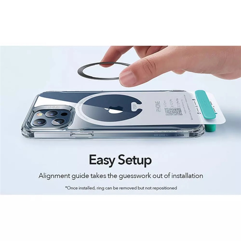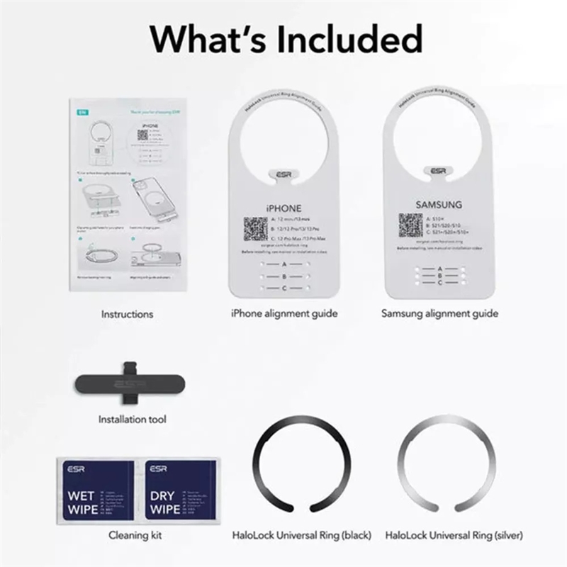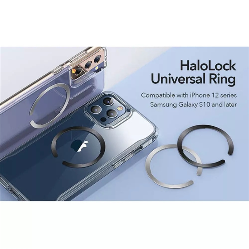 رینگ مگنتی ESR HaloLock Universal Ring، یک پک دوتایی شامل رینگ‌های مغناطیسی با طراحی مشکی و نقره ای است که به راحتی قابل نصب بر روی جعبه گوشی شماست. با استفاده از این رینگ مغناطیسی با طراحی منحصر به فرد با قابلیت قفل وضعیت، می توانید جعبه گوشی خود را به مگنتی مجهز کنید. طراحی ۳۶۰ درجه‌ای مغناطیسی این رینگ، یک قفل وضعیت ایمن ایجاد می کند و از چرخش جلوگیری می کند، بنابراین لوازم جانبی مورد علاقه شما همیشه در جای خود باقی می مانند. این رینگ اطمینان حاصل می کند که تراز مناسب بین گوشی و نوار شارژدهی حفظ شده و کارایی شارژ را به حداکثر برساند تا شما بتوانید به راحتی از شارژ بی‌سیم استفاده کنید.