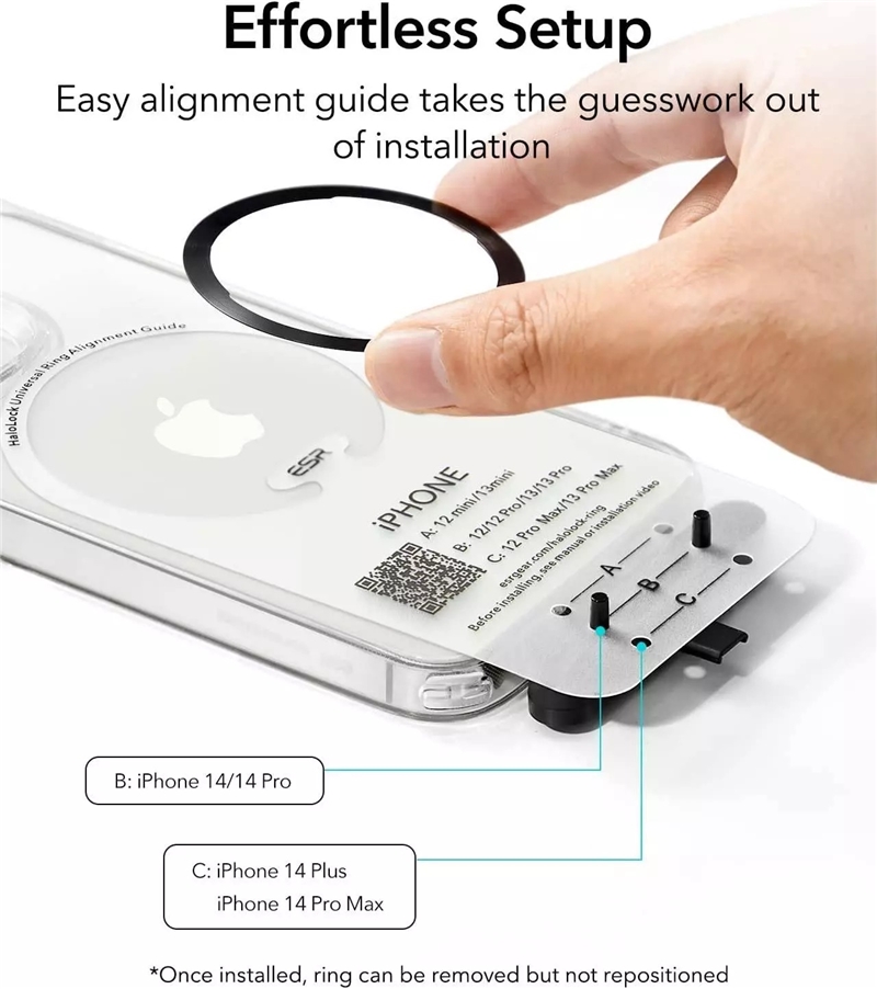 راهنمای ترازبندی شفاف، قرار دادن حلقه را روی هر یک از مدل‌های سازگار را آسان می‌کند؛ پس از نصب، حلقه قابل حذف است اما قابل جابجایی نیست.