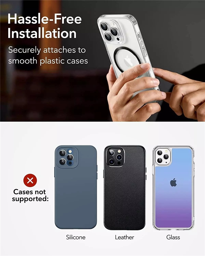 این محصول با تبدیل کیس عادی شما به یک کیس مغناطیسی سازگار با شارژرها و لوازم جانبی MagSafe، شارژ بی‌سیم ایمن و سریع را فراهم می‌کند.