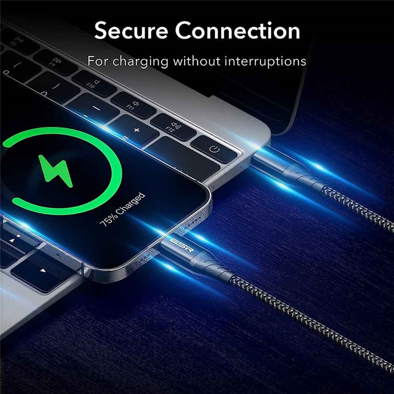 ۶. پایداری ارتباط: طراحی دقیق و استفاده از مواد با کیفیت فوق‌العاده، باعث می‌شود کابل USB-C به لایتنینگ ESR در هر دو سر ارتباطی پایداری را تضمین کند. این کابل شارژی USB-C به لایتنینگ را فراهم می‌کند که به شما اجازه می‌دهد بدون وقفه شارژ کنید.
