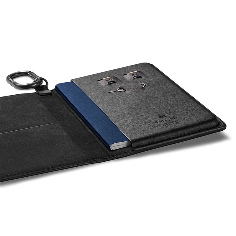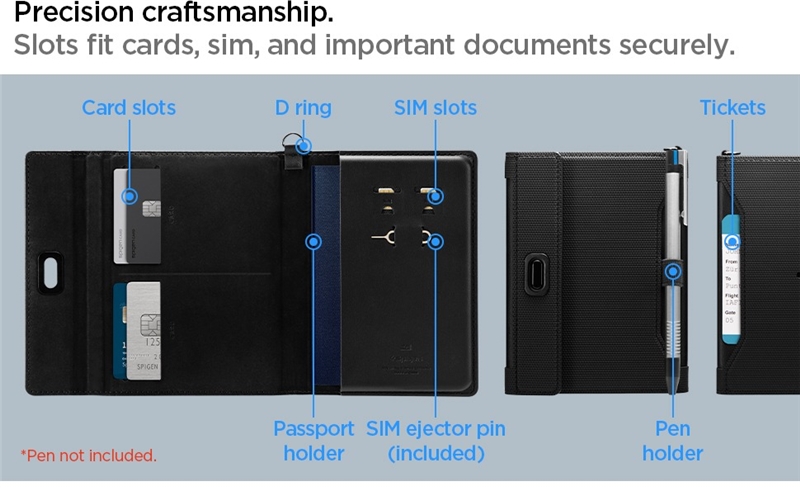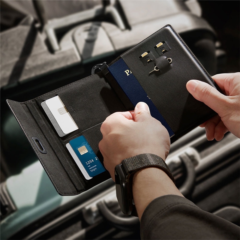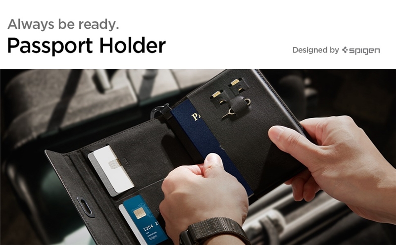 کیف پاسپورت اسپیگن دارای فضای ذخیره‌سازی فراوانی است. شامل ۴ جیب کارت اعتباری/شناسایی، یک جیب برای قرار دادن پاسپورت، ۲ جیب کارت SIM، یک نگهدارنده بلیط سفر و یک نگهدارنده قلم است. همچنین این کیف شامل یک نگهدارنده و ابزار برداشت کارت SIM نیز می‌باشد.
