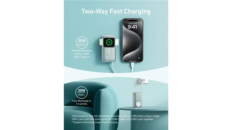 این پاوربانک مجهز به درگاه USB-C با توان خروجی 35 وات است و میتواند گوشیهای هوشمند، تبلتها، لپتاپهای سبک مثل MacBook Air و آیپد را با سرعت بالا شارژ کند.