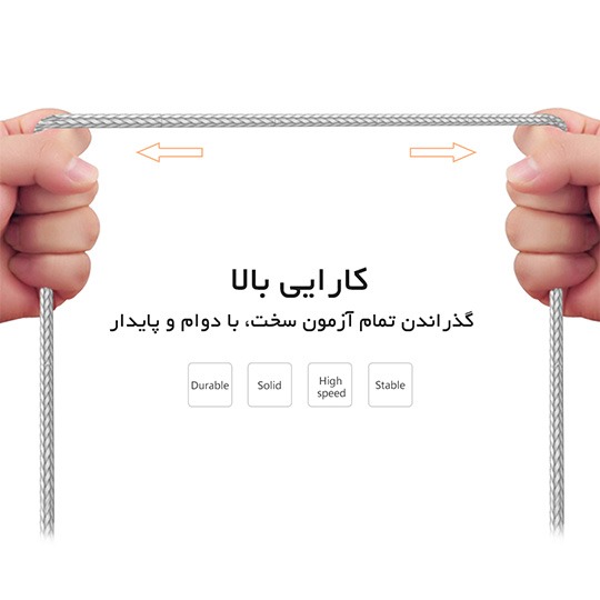 ساختار مقاوم و بادوام: بدنه کابل از ترکیب نایلون بافتهشده و آلیاژ آلومینیوم ساخته شده است که مقاومت بالایی در برابر کشش، خمشدگی و سایش دارد.