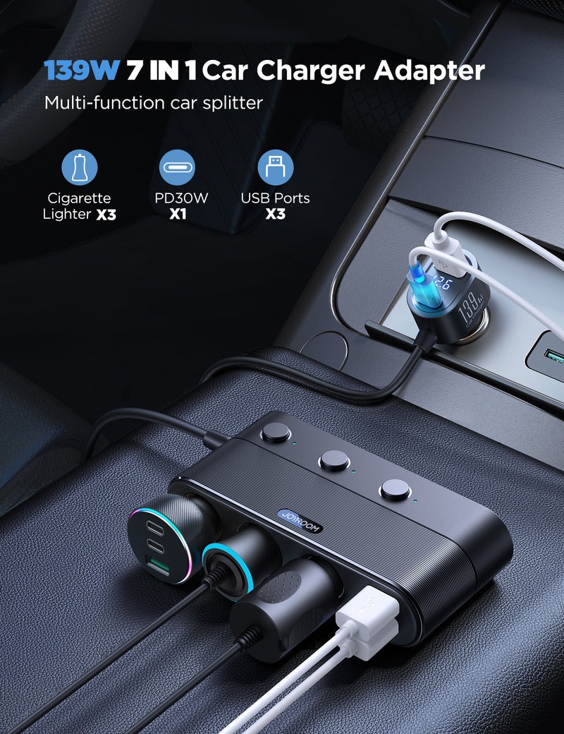شارژر فندکی 7 کاره جویروم مدل JR-CCL01 – توان 179 وات برای شارژ همزمان چندین دستگاه در خودرو