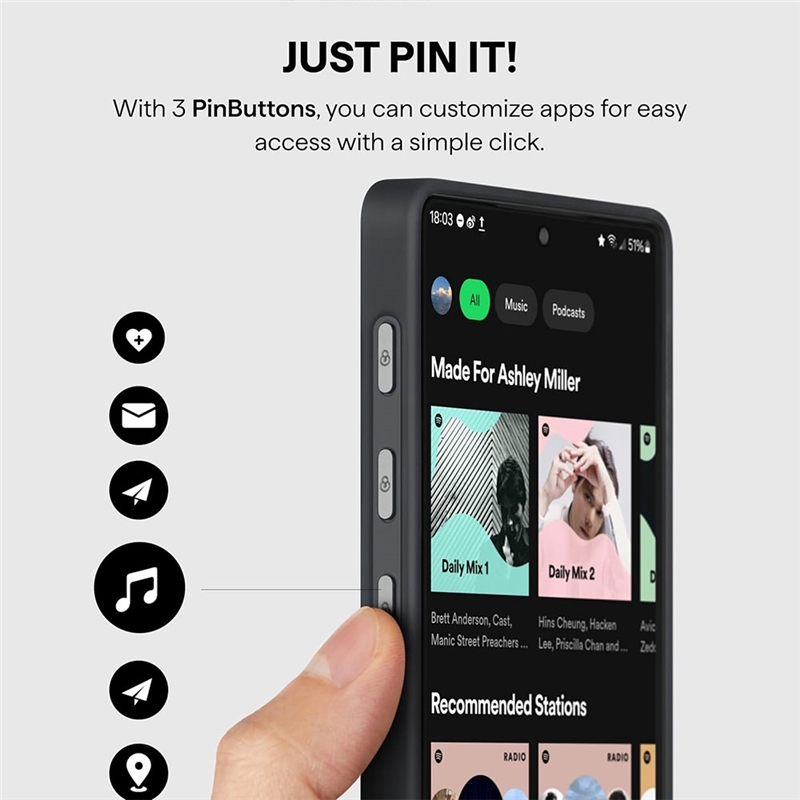 دکمه PIN تعبیهشده روی قاب به شما این امکان را میدهد تا برخی عملکردهای گوشی را بدون لمس صفحهنمایش و تنها با یک فشار فعال کنید. این دکمه کاملاً قابل تنظیم است و میتواند برای اجرای سریع دوربین، ضبط صدا، چراغ قوه یا هر عملکرد دلخواه دیگر برنامهریزی شود.