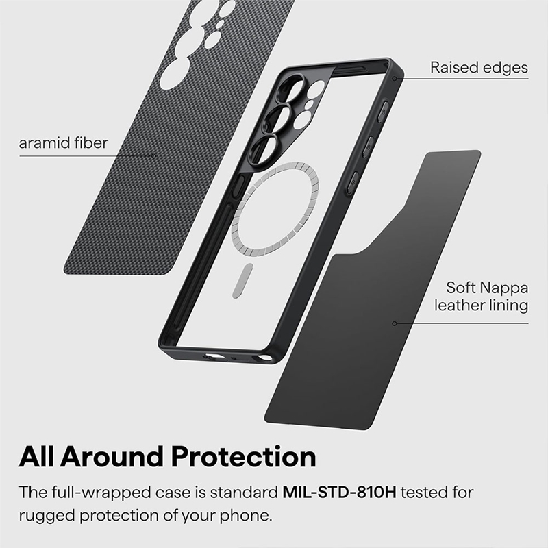 استفاده از فیبر آرامید 600D، که هم در صنعت هوافضا و هم در تجهیزات نظامی کاربرد دارد، باعث شده این قاب در برابر خطوخش، ضربه و سایش کاملاً مقاوم باشد؛ در عین حال، فوقالعاده سبک و خوشدست باقی بماند.