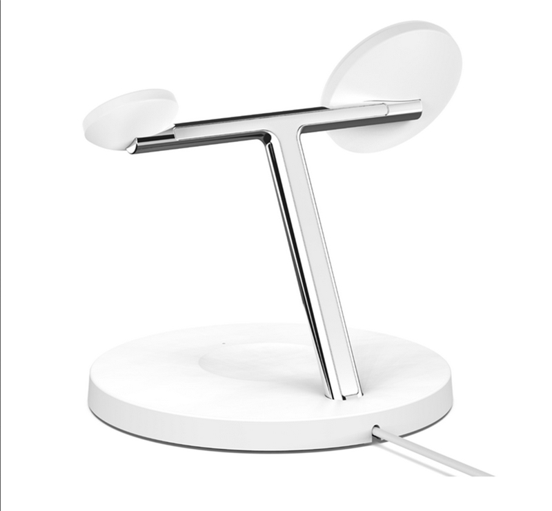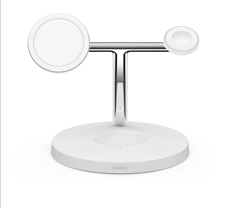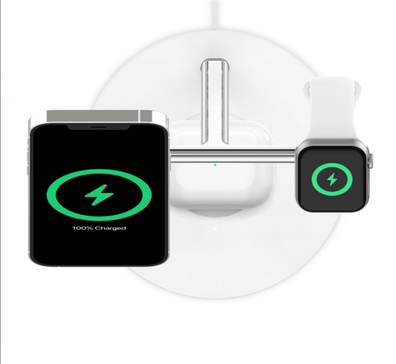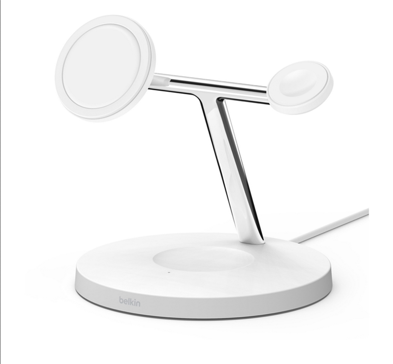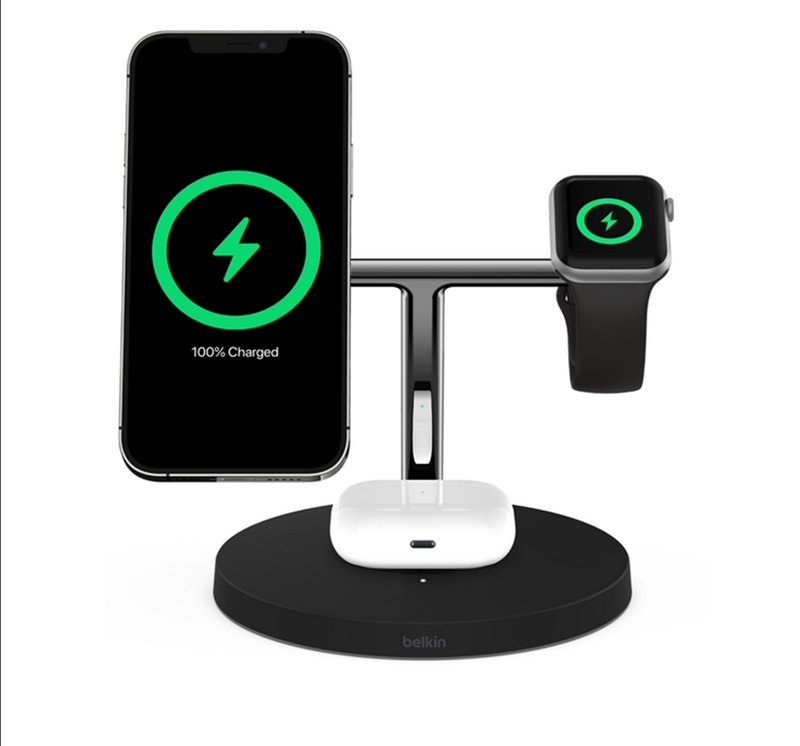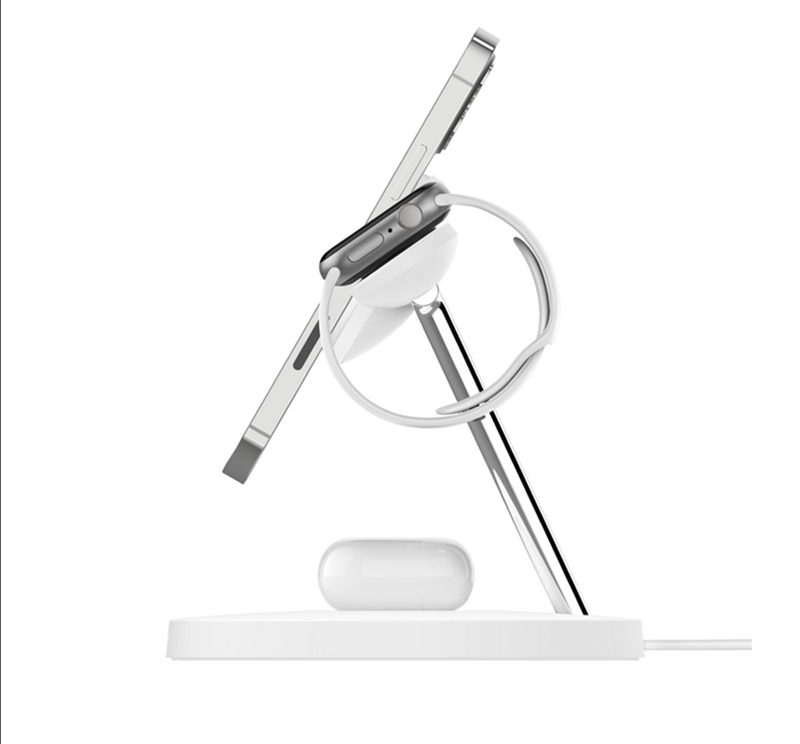 استند شارژ بلکین Boost charge pro یک پد مگ سیف مخصوص آیفون 12 به بعد، محلی برای شارژر اپل واچ و یک پد شارژ وایرلس برای دستگاهی مثل ایرپاد یا گوشی دیگر دارد.