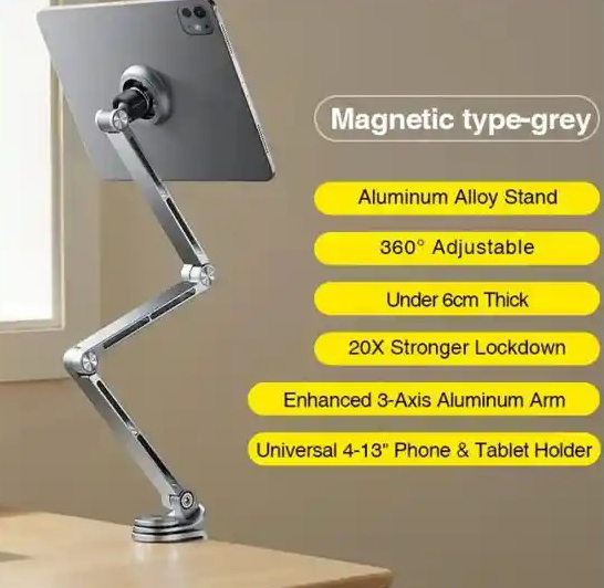 سایر توضیحاتطراحی سه‌تایی جمع‌شونده (tri-fold) جهت ذخیره‌سازی فشرده و قابل حمل . بازوی آلیاژ فلزی با امکان چرخش 360 درجه برای انعطاف‌پذیری در انتخاب زاویه دید . اتصال مگنتی موبایل و تلبت پایه چرخشی با قفل تاب (twist-lock) که ضد لغزش است و روی سطوح مختلف مانند میزهای نازک، ضخیم، لوله‌های گرد یا شیشه‌ای پایدار می‌ماند .