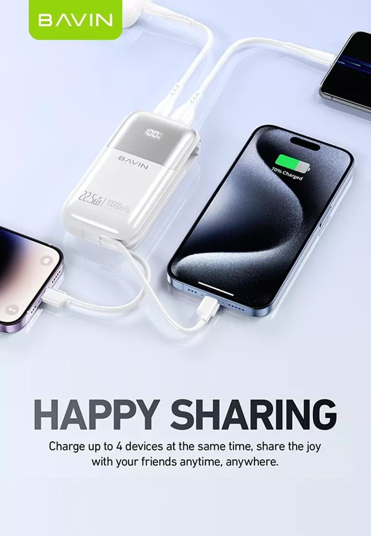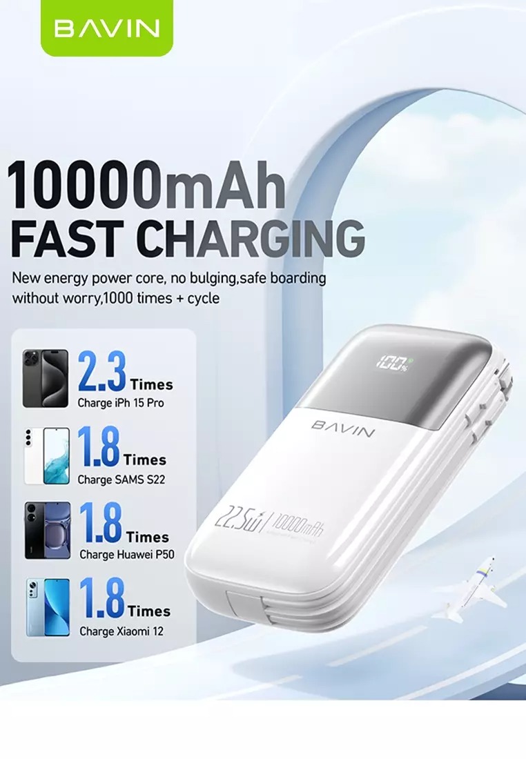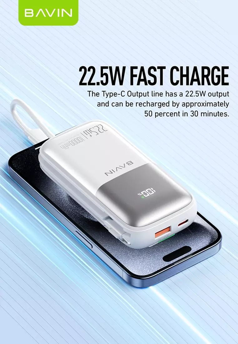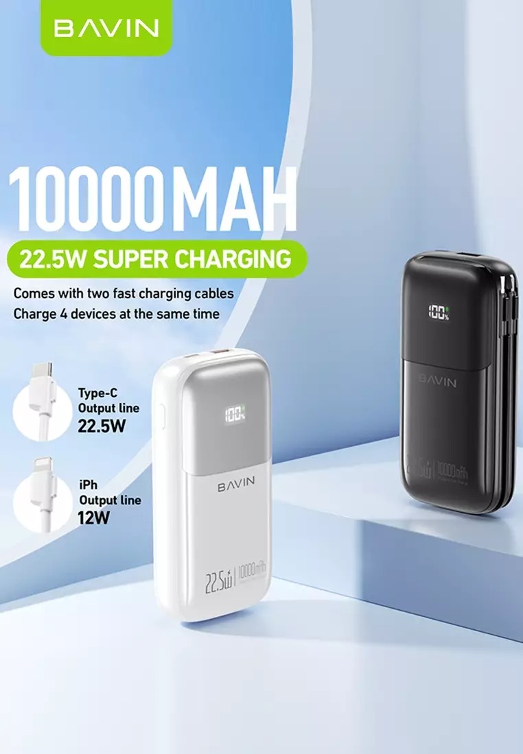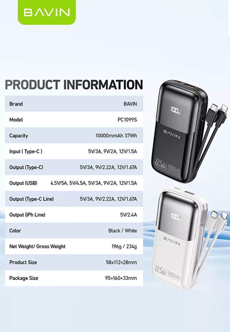 پاوربانک 10000 باوین Bavin PC1099 توان 22.5 وات همراه با 2 کابل متصل
