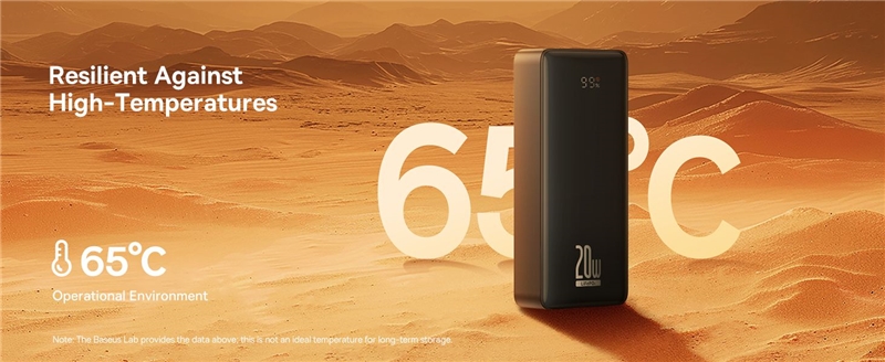 پاوربانک بیسوس LiFePO4 قادر است دمایی تا 65 درجه سانتی‌گراد را بدون کاهش کارایی تحمل کند. این ویژگی در استفاده‌های طولانی‌مدت یا در محیط‌های گرم، امنیت و آرامش خاطر بیشتری فراهم می‌کند. بدنه‌ی دستگاه نیز از مواد مقاوم در برابر حرارت ساخته شده تا خطرات احتمالی ناشی از گرما را به حداقل برساند.
