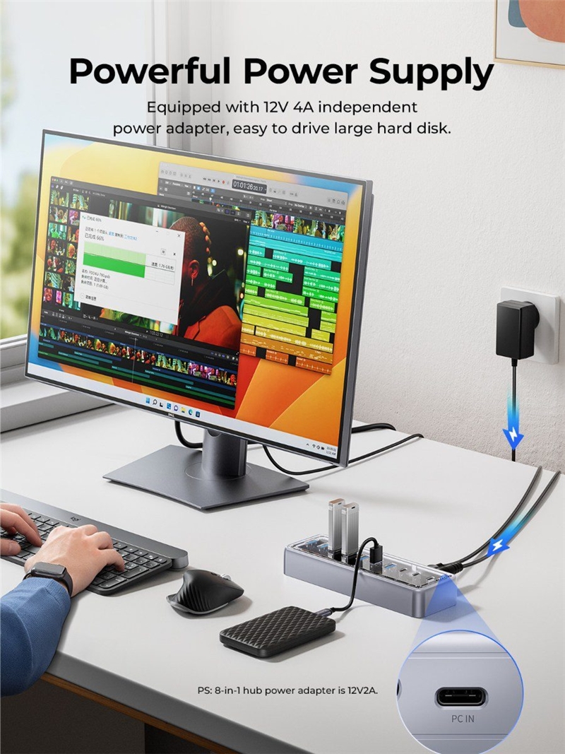 داک استیشن ۱۰ پورت با رابط برق DC12V/4A کار میکند که به آن اجازه میدهد تا به طور همزمان چندین دستگاه را تغذیه کند. این منبع تغذیه قوی به ویژه برای کاربرانی که از چندین دستگاه به طور همزمان استفاده میکنند بسیار مفید است و از بروز مشکلات ناشی از کمبود برق جلوگیری میکند.