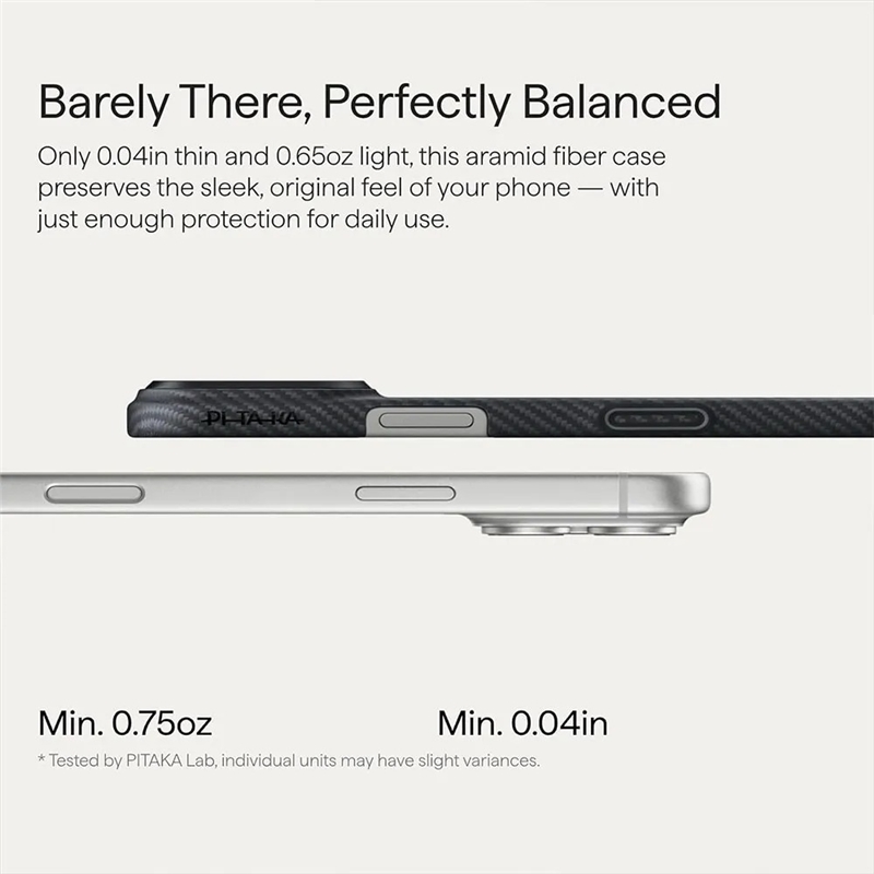 قاب آیفون 17 پرو مکس برند پی تاکا مدل Ultra Slim 600D (Twill) (PitaTap) یکی از سبک‌ترین و ظریف‌ترین قاب‌های محافظ ساخته‌شده از الیاف آرامید است. این متریال فوق‌العاده مقاوم که در صنایع هوافضا و نظامی استفاده می‌شود، دوام بالا را در کنار وزن بسیار کم ارائه می‌دهد تا گوشی شما بدون سنگینی اضافی محافظت شود.