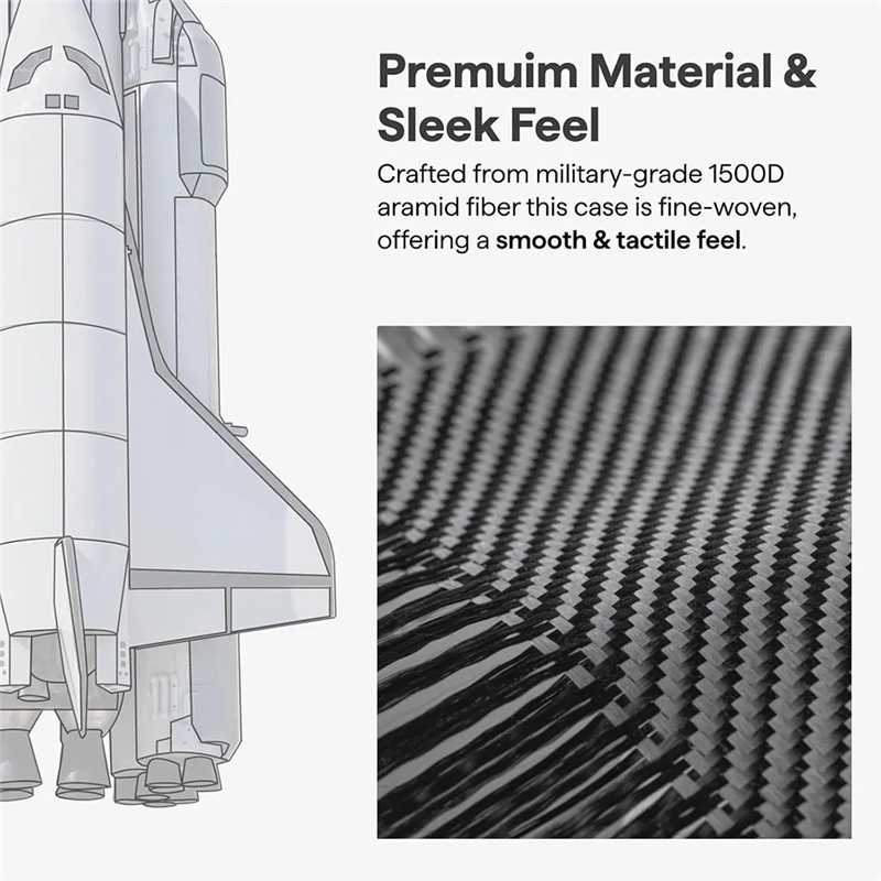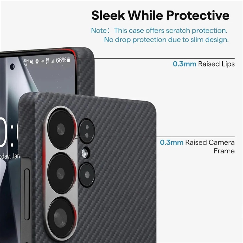 با ضخامت حدود ۰.۹۵ میلیمتر و وزن تنها ۲۳.۸۹ گرم، قاب گلکسی S25 Ultra مدل PITAKA Ultra-Slim Case 600D یک محافظ تقریباً نامرئی است که برای طرفداران طراحی مینیمال و سبک، انتخاب ایدهآل محسوب میشود. لمس بافت لطیف آرمید، حس لوکس و دلپذیری به کاربر منتقل میکند و تجربه نگه داشتن گوشی را لذتبخش میکند.