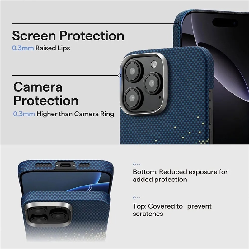 الیاف آرمید به کار رفته در قاب آیفون ۱۶ پرو مکس PITAKA Moonrise Tactile Woven، مقاومت فوق‌العاده‌ای در برابر خراش و خوردگی فراهم می‌کند، بدون اینکه وزن گوشی افزایش یابد. این ماده در صنایع هوافضا و نظامی هم استفاده می‌شود، بنابراین می‌توانید مطمئن باشید که آیفون شما در دستان شما کاملاً محافظت شده است.