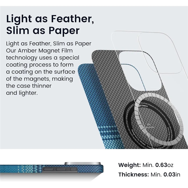 دیگر نیازی به خارج کردن قاب برای شارژ بی‌سیم یا استفاده از لوازم جانبی MagSafe نیست. قاب آیفون ۱۶ پرو مکس PITAKA Moonrise Tactile Woven به لطف فناوری SlimBoard سرعت شارژ بی‌سیم را کاهش نمی‌دهد و تمامی لوازم جانبی MagSafe را پشتیبانی می‌کند.