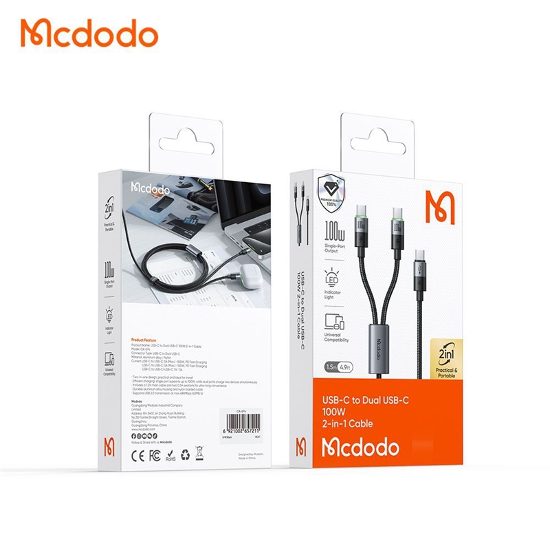 کابل شارژ چند سر تایپ سی 100 وات 1.5 متر مک دودو Mcdodo 2in1 Cable CA-6740
