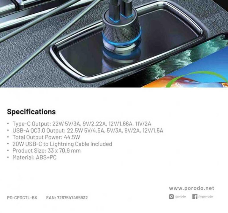 یک وسیلهی جانبی ساده و در عین حال کاربردی که حضور آن در هر خودرویی واجب است. تمام شدن شارژ گوشی و تبلت هنگام رانندگی یا سفر میتواند مشکل بزرگی باشد، مخصوصا اگر یک آدرس ضروری یا اطلاعات مهمی را در آن ذخیره کرده باشید. با خرید شارژر فندکی پرودو مدلCar Charger 44.5Wمیتوانید گوشی خود را با سرعت بالایی شارژ کنید و دیگر نگران خاموش شدن آن نباشید. این شارژر دارای دو پورت است و کیفیت بالایی دارد.از پروتکلهای شارژ سریع مختلف مانندPDوQC3.0بهره میبرد. توان خروجی آن44.5وات است و در کنار سازگاری با فست شارژ میتوانید در مدت زمان خیلی کوتاهی گوشی خود را فول شارژ کنید.روی بدنه دو پورت وجود دارد که یکی از آنها از نوع تایپ سی و دیگری همUSBاست. بنابراین میتوانید دو دستگاه را به صورت همزمان شارژ کنید.شارژر فندکی پرودو مدل Car Charger 44.5Wکاملا جمع و جور و کوچک است و هنگام رانندگی به هیچ وجه مزاحمتی ایجاد نمیکند.جنس این شارژر فندکی از ترکیب پلی کربنات وABSاست.با توجه به شارژ سریع ممکن است حرارت بالایی ایجاد شود اما این متریال سبب میشود شارژر گرم و داغ نشود و مشکلی برای آن به وجود نیاید.به علاوه این مواد ضد حریق هم هستند و با خیال راحت میتوانید از آن استفاده کنید.این فندکی دارای پردازندهای هوشمند است که میزان توان لازم برای هر گوشی یا تبلت را به صورت خودکار تشخیص میدهد. این ویژگی سبب میشود جریان و ولتاژی که به گوشی شما میرسد کمتر و بیشتر از میزان بهینه نباشد و به مرور زمان باتری گوشی دچار آسیب نشود.شارژر فندکی پرودو مدلCar Charger 44.5Wبا ولتاژ12-24ولت سازگار است و همین هم سبب میشود در اکثر خودروها، ونها و … قابل استفاده باشد. به علاوه خیلی خوب و محکم سر جای خود فیکس میشود و جریانی ثابت و بدون قطعی دارد.شارژر فندکی پرودو مدلCar Charger 44.5Wدارای استانداردهای امنیتیRohs،FCCوCEاست. در برابر آسیبهای احتمالی مانند اتصال کوتاه، شارژ و دشارژ بیش از حد، بالا رفتن دمای نامتعارف و اتفاقاتی از این قبیل مقاوم است و میتوانید به آن اعتماد کنید.این شارژر فندکی با توجه به توان خروجی بالایی که دارد در زمان اندکی گوشی شما را شارژ میکند. استفاده از آن خیلی راحت است و با خیالی راحت میتوانید گوشی خود را شارژ کنید.همراه این فندکی یک عدد کابل تایپ سی به لایتنینگ نیز ارسال میشود.