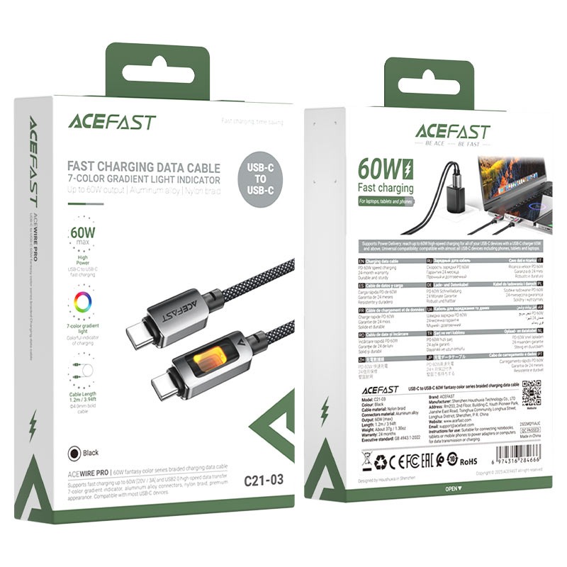 کابل ACEFAST C21-03 یک کابل کاملاً استاندارد، سریع و بادوام برای شارژ و انتقال داده دستگاههای مجهز به پورت USB-C است. این مدل با پشتیبانی از توان 60 وات (PD 60W) و کیفیت ساخت بالا، گزینهای ایدهآل برای استفاده روزمره، حرفهای و طولانیمدت محسوب میشود.