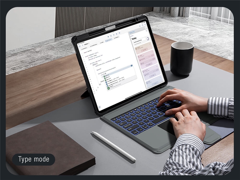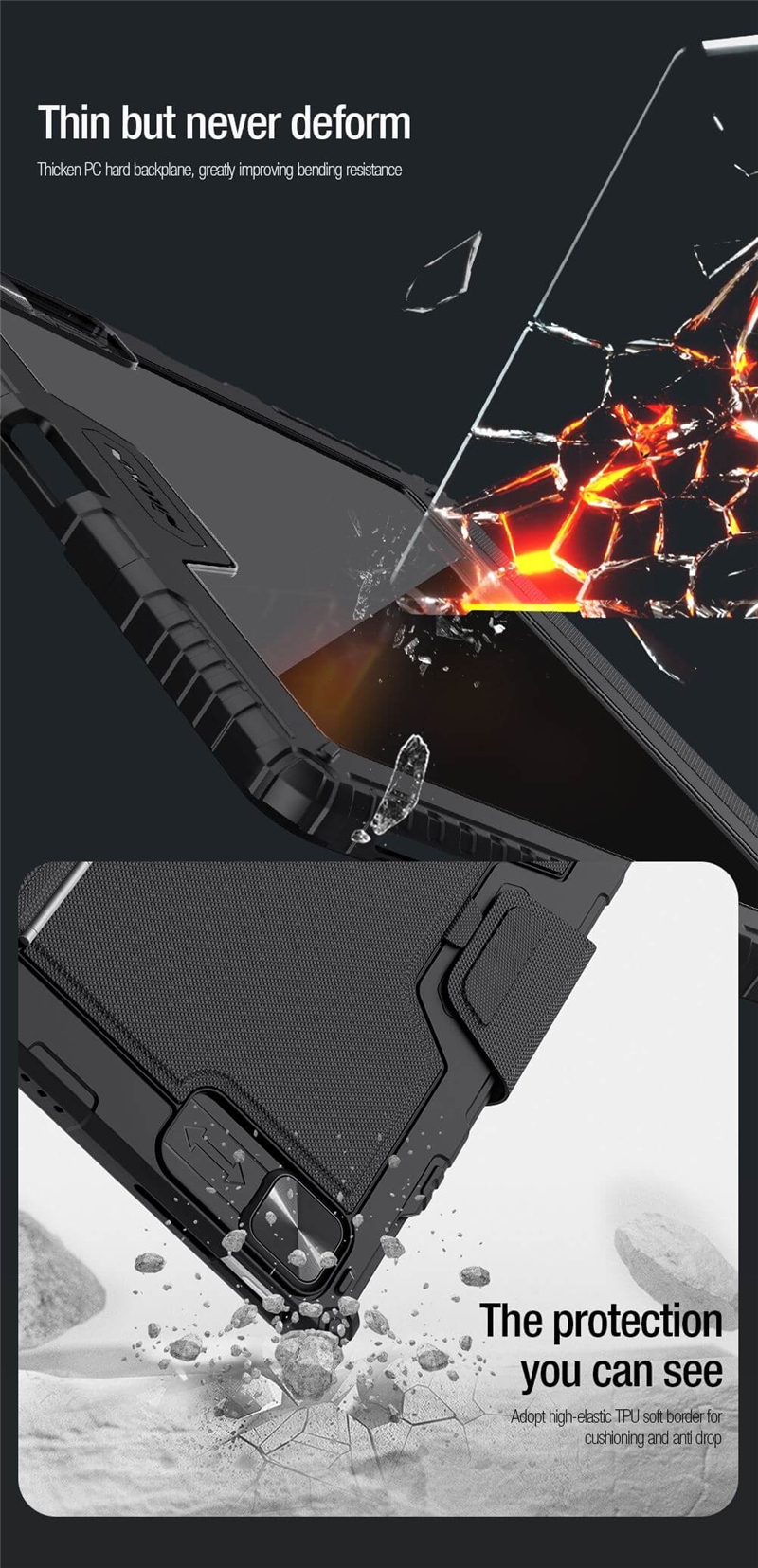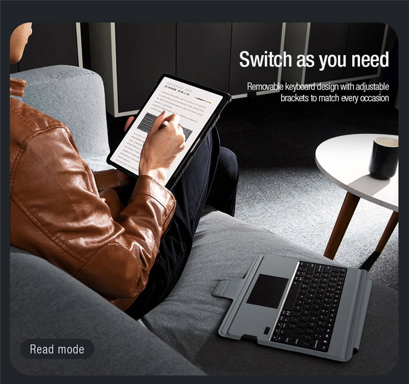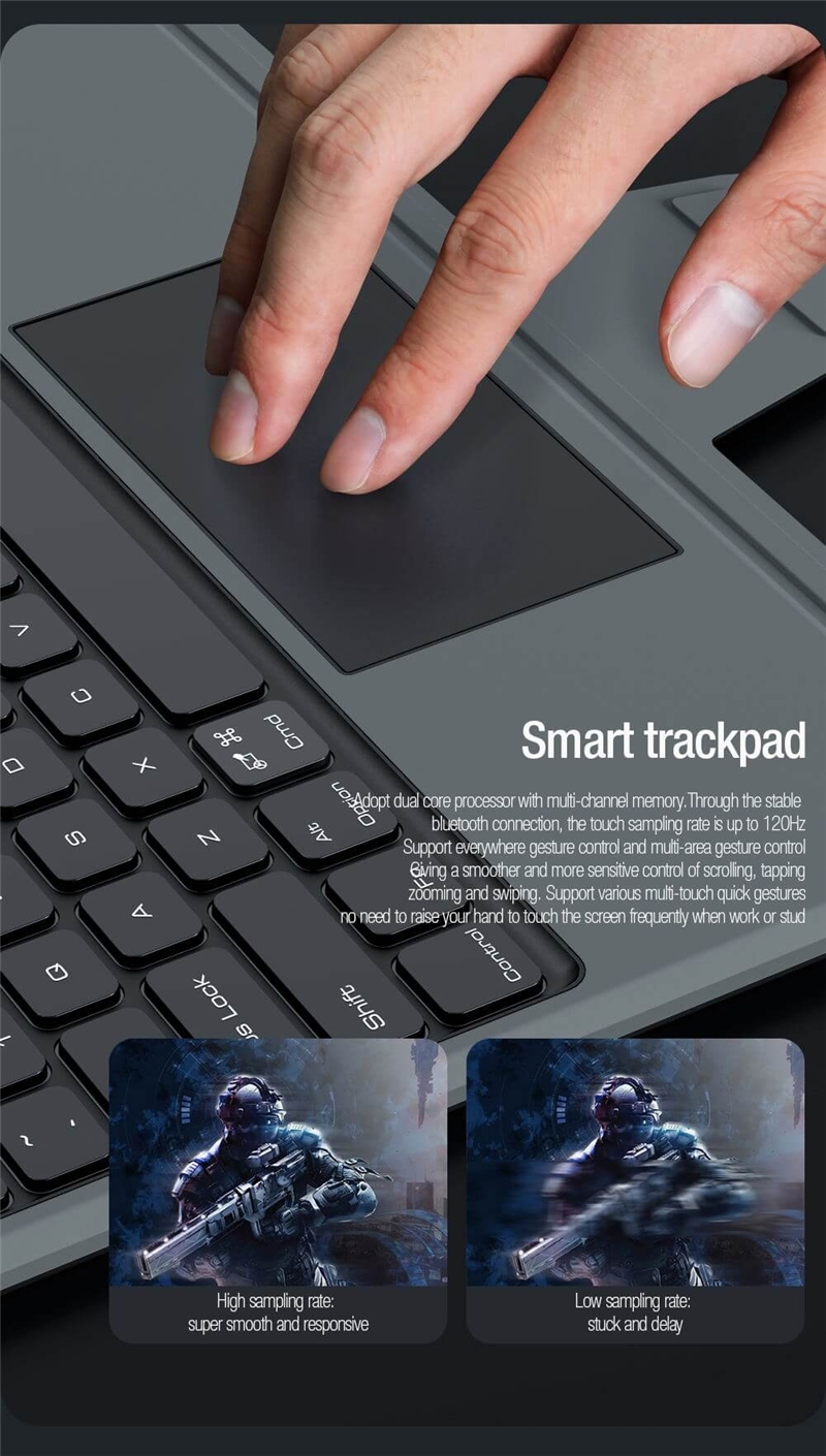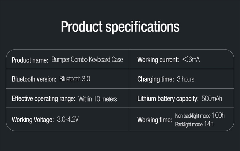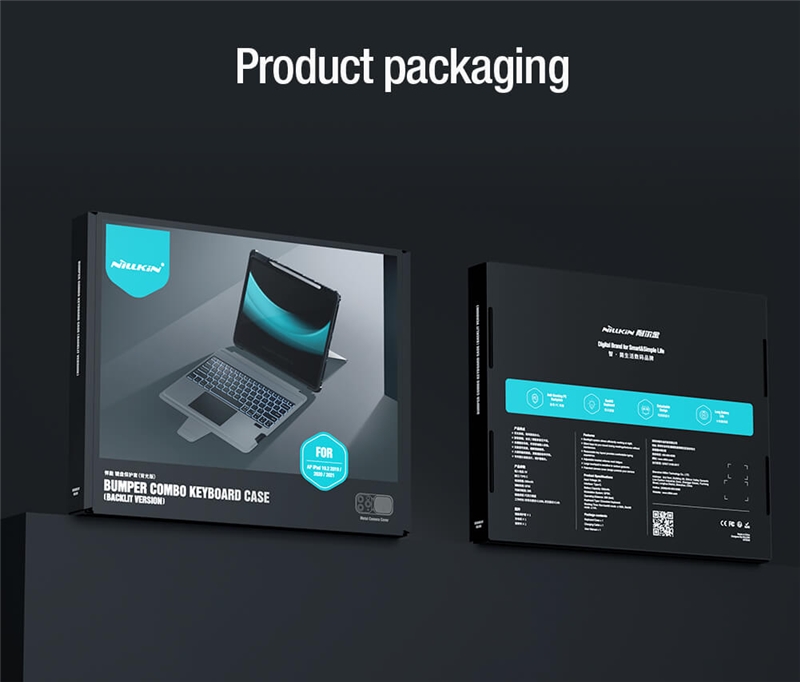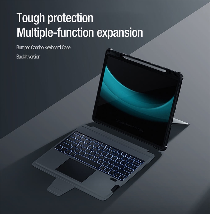 کیف کلاسوری نیلکین مدل Bumper Combo Backlit Keyboard جدیدترین نسخه Combo Keyboard می باشد که در مدل Backlit علاوه بر ویژگی های نسخه قبلی ویژگی نور پس زمینه در کیبورد با 7 رنگ متفاوت به آن اضافه شده که دیگر در فضای کم نور و یا شب به راحتی میتوانید از کیبورد استفاده کنید و دیگر دغدغه نور هنگام تایپ کردن را نداشته باشید.جنس این کاور ازTPUوPCساخته شده که دارای مقاومت بالایی می باشد.این کیف کلاسوری دارای محافظ دوربین بوده که به صورت کشویی عمل میکند.یکی از قابلیت های مفید در قاب تبلت ها داشتن استند است؛چون این دستگاه ها ابعاد بزرگی دارند و نگهداری از آن‌ها روی استند بسیار راحت تر و کم خطر تر است.از همین رو کیف کلاسوری دارای یک استند تاشو است که استحکام کافی برای نگهداشتن و استفاده از تبلت را خواهد داشت.شما می توانید حالت های مختلفی برای قرار گرفتن تبلت انتخاب کنید.این استند قابلیت تنظیم زاویه بین 110تا180درجه را دارد.این محصول نیلکین دارای یک کیبورد قابل جدا شدن می باش .شما در صورت نیاز می توانید از این کیبورد استفاده کرده و یا آن را جدا کنید.کلیدهای این کیبورد به گونه‌ای(قطره‌ای)طراحی شده که قالب انگشتان شما باشد.این کلیدها بسیار بی صدا بوده و وزن پایینی دارد؛بعلاوه کار با آن شما را خسته نمی‌کند.کلیدهای کیبورد کیف کلاسوری بسیار حساس بوده و با کمترین فشار عمل خواهد کرد.بر روی این کیبورد یک پد لمسی وجود دارد که می توانید از آن به جای موس استفاده کنید.شما می توانید از طریق بلوتوث این کیبورد را به دستگاه خود متصل کنید.نرخ نمونه برداری لمسی پد لمسی آن120هرتز بوده که بسیار حساس بوده و از چند لمس همزمان پشتیبانی می کند.این کیبورد دارای یک باتری5000میلی آمپر ساعتی بوده که برای پر شدن آن نیاز به حدود 3 ساعت شارژ بوده و با پر بودن شارژ تا100 ساعت می توانید از آن استفاده کنید؛البته این عدد برای روزی2ساعت کار با کیبورد است که متناسب با استفاده شما متغییر خواهد شد.قابل ذکر است نسخه بلوتوث این کیبورد3.0می باشد و محدوده عملکرد آن حدود10متر است.در قسمت جلویی این قاب، جای برای قرار گرفتن قلم هوشمند اپل تعبیه شده که می توانید قلم خود را در این قسمت ها قرار دهید. با قرار گرفتن قلم در قسمت جلویی تعبیه شده در تبلت، می توانید قلم خود را به صورت وایرلس شارژ کنید.