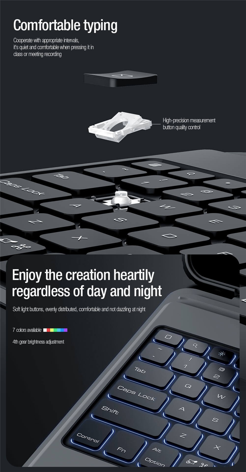 امکاناتشارژ بیسیم قلم کیبورد بلوتوثی نور پس زمینه کیبورد با 7 رنگ متفاوت