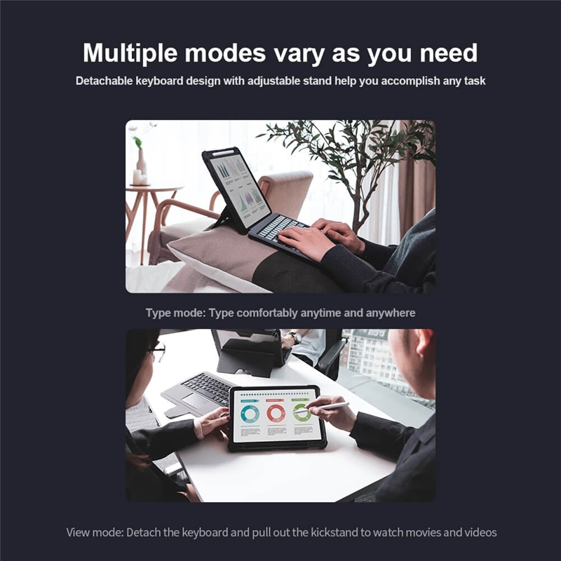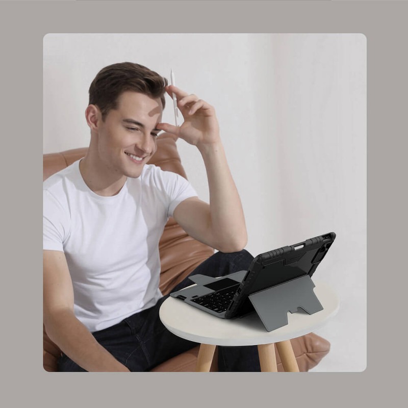 یکی از قابلیت های مفید در قاب تبلت ها داشتن استند است؛ چون این دستگاه ها ابعاد بزرگی دارند و نگهداری از آنها روی استند بسیار راحت تر و کم خطر تر است. از همین رو کیف کیبورد دار آیپد Apple iPad 10.2 2019 / 2020 / 2021 دارای یک استند تاشو است که استحکام کافی برای نگهداشتن و استفاده از تبلت را خواهد داشت. شما می توانید حالت های مختلفی برای قرار گرفتن تبلت انتخاب کنید. (عکس داخلی گالری) این استند قابلیت تنظیم زاویه بین 110 تا 180 درجه را دارد، پس فقط کافیست روی صندلی لم بدهید و کتاب بخوانید یا فیلم تان را ببینید.