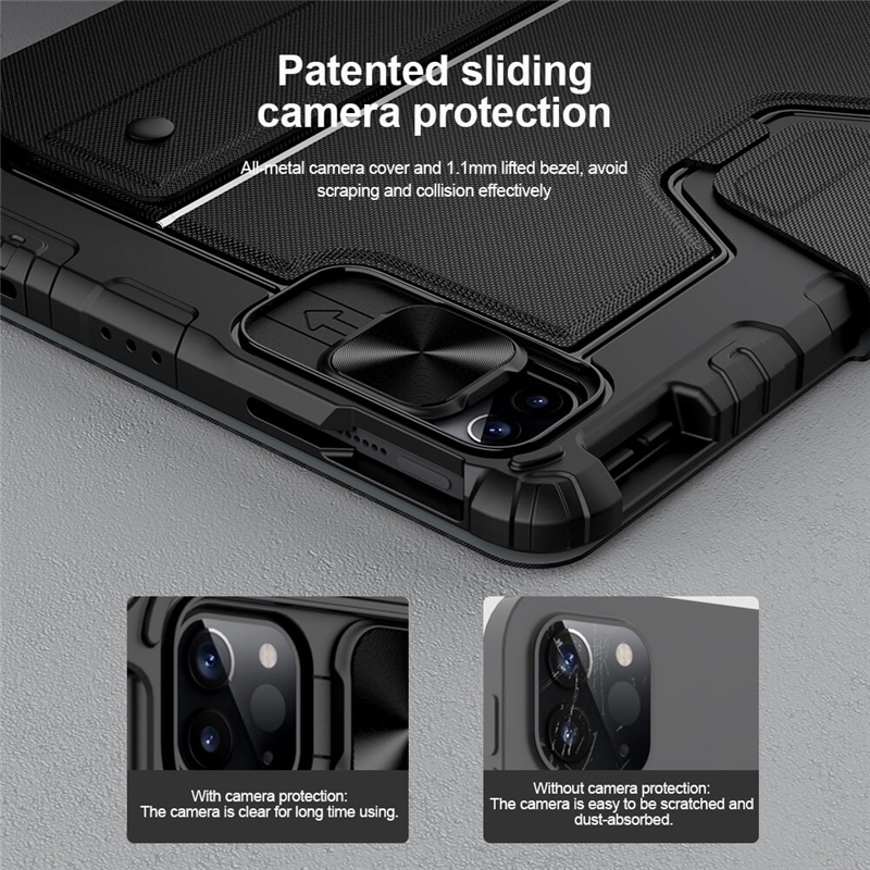 کیف کیبورد دار آیپد Apple iPad 10.2 2019 / 2020 / 2021 دارای محافظ دوربین بوده که به صورت کشویی عمل میکند و می توانید در صورت نیاز آن را باز کنید.
