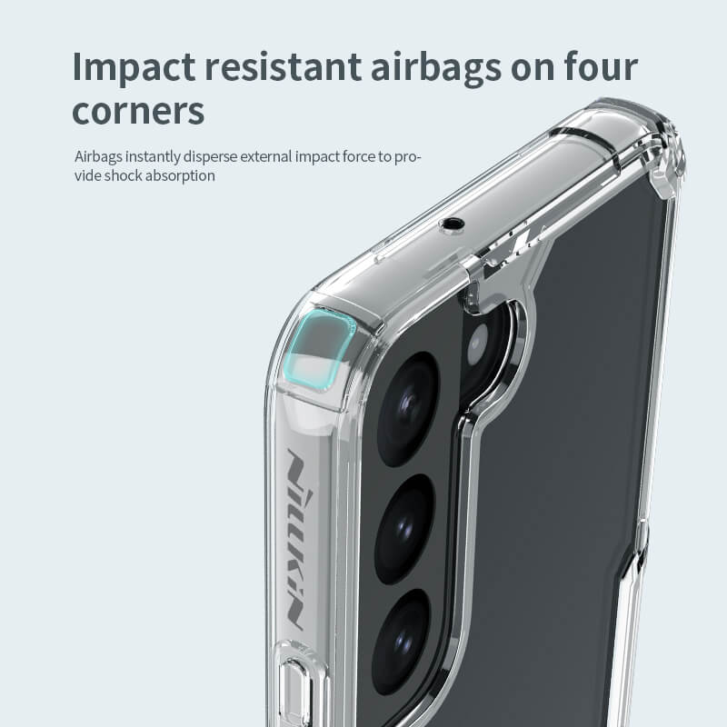 گوشههای قاب S22 Samsung نیلکین مدل Nature TPU Pro دارای طراحیهای ایربگ مانند هستند. این فرم از طراحی باعث میشود تا ضربه بهتر دفع شود. این به اصطلاح کیسههای هوا! با فاصلهای که در قاب ، از بدنه موبایل ایجاد کردهاند، مانع از برخورد مستقیم ضربه به تلفن همراه از قسمت گوشهها خواهند شد. کنارههای قاب نیز دارای فرمی است که از لغزش قاب هنگام در دست گرفتن آن جلوگیری میکند.