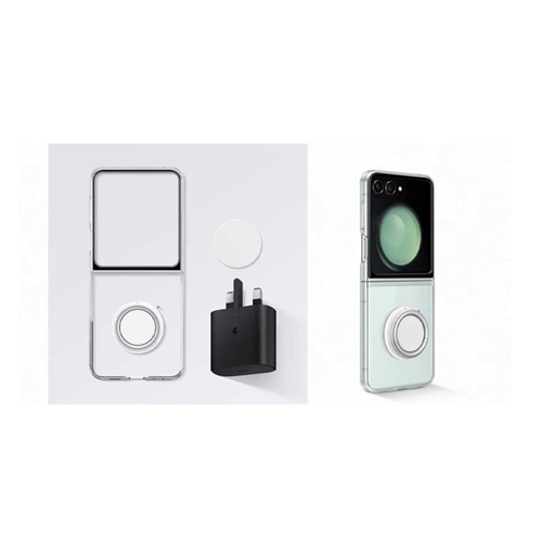 پک کاور و شاژر 25 وات سامسونگ SAMSUNG Galaxy Z Flip 5 Starter Pack with 25W Charger EF-XF73KKTEGGB پایه و حلقه قابل جابجایی ظاهری شفاف و زیبا شارژر با توان 25 وات دارای حقه و پایه قابل حمل