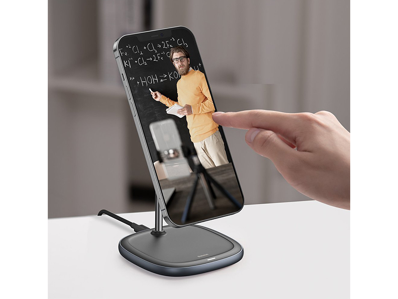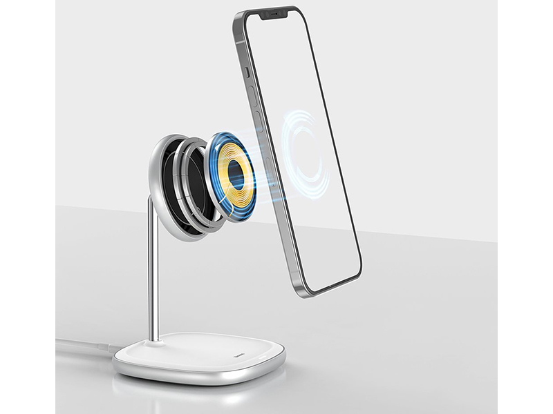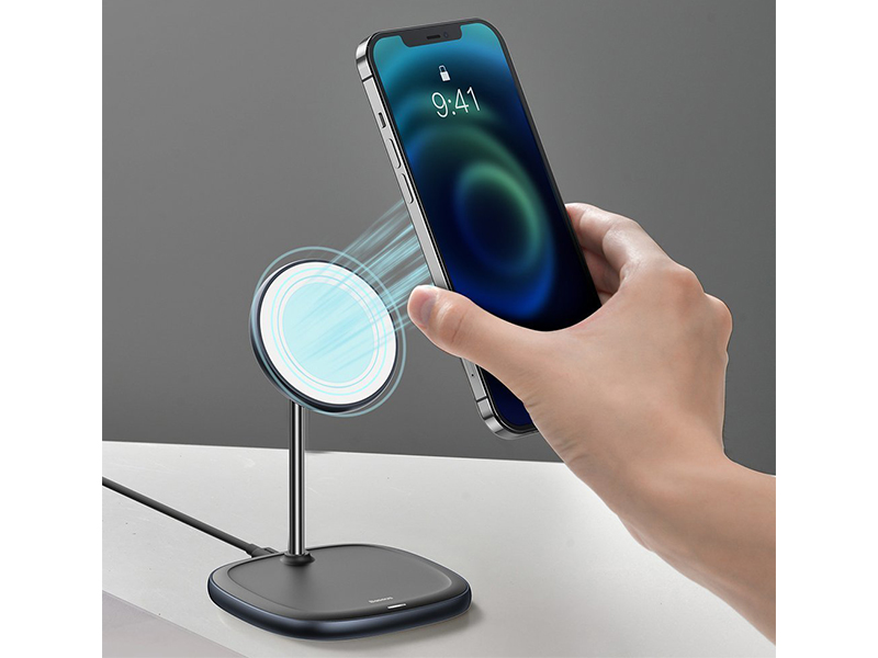 با روی کار آمدن شارژرهای وایرلس و برای راحتی حال کاربران هولدرهای شارژ وایرلس تولید شدند. این هولدرها علاوه بر اینکه دارای استند نگهداری گوشی هستند قابلیت شارژ وایرلس را نیز دارند. بدین ترتیب کاربر می‌تواند در حالی که از روی استند فیلم می‌بیند گوشی از را شارژ هم بکند. هولدر گوشی Baseus Magnetic Desktop Bracket Wireless Charger WXSW-01 یک استند رومیزی از کمپانی بیسوس است که تنها با سری 12 به بعد آیفون اپل سازگار است.
