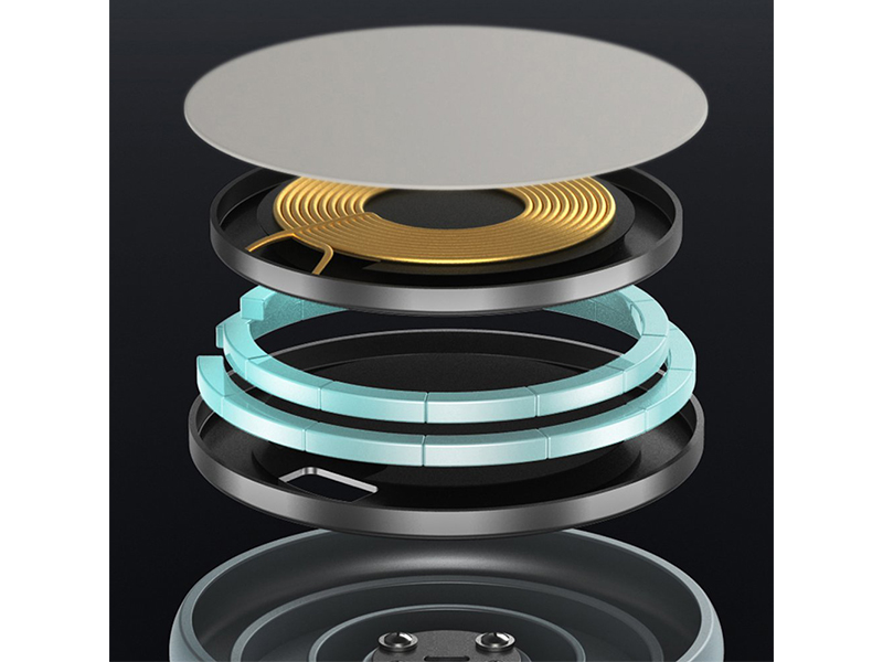 همانطور که پیش تر گفتیم شارژر وایرلس بیسوس WXSW-01 فقط مناسب سری 12 به بعد آیفون است. داخل این شارژر دو حلقه مغناطیسی تعبیه شده که به بدنه آیفون 12 می‌چسبند و از هدر رفت انرژی جلوگیری می‌کنند. این حلقه‌ها از جنس فریت می‌باشند که دارای ترکیبات آهنرباییست و معمولا در دستگاه ‌های الکتریکی فرکانس بالا به کار می‌رود. روی این آهنرباها با یک لایه سیم پیچ القایی مسی و پنل پلی کربنات عایق پوشانده شده است.