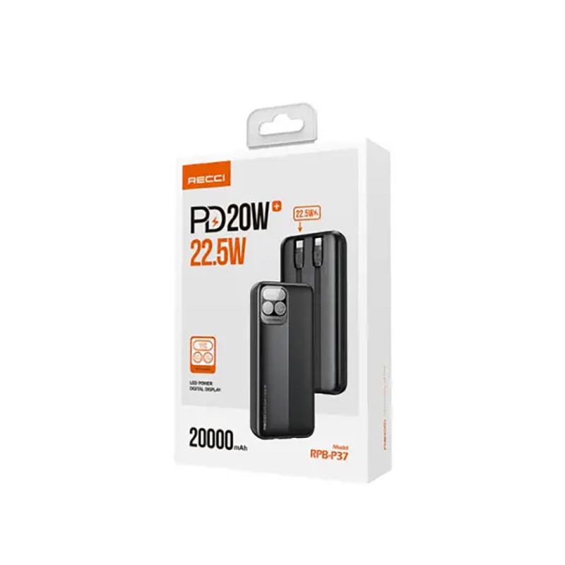 پاوربانک رسی مدل RPB-P37 ظرفیت 20000 میلی آمپر ساعت یکی از محصولات شرکت رسی است. پاوربانک RPB-P37 با ظرفیت 20000 هزار میلی آمپر ساعت به بازار عرضه گردید است ، همچنین این پاوربانک در ظرفیت های 10000 هزار و 30000 هزار میلی آمپر ، با نام های P36 و P38 به فروش می رسد. یکی از دغدغه های کاربران هنگام استفاده از پاوربانک این است که برای آن کابل تهیه کنند ، به همین دلیل در طراحی این پاوربانک دو عدد کابل به صورت متصل به پاوربانک قرار گرفته تا خریداران دیگر نیاز به خرید کابل و یا استفاده از کابل های بلند نباشند. همچنین به غیر از کابل ها دوعدد خروجی فست شارژ در نظر گرفته شده و شما می توانید همزمان 4 دستگاه را شارژ نمایید. پاوربانک رسی مدل RPB-P37 ظرفیت 30000 میلی آمپر ساعت دارای سه عدد نمایشگر ال ای دی بوده که همزمان میزان شارژ باقی مانده ، ولتاژ ورودی و ولتاژ خروجی را نمایش می دهد. این پاوربانک از تکنولوژی فست شلرژ پشیتیبانی میکند و به طور همزمان می تواند چندین دستگاه را شارژ نماید.