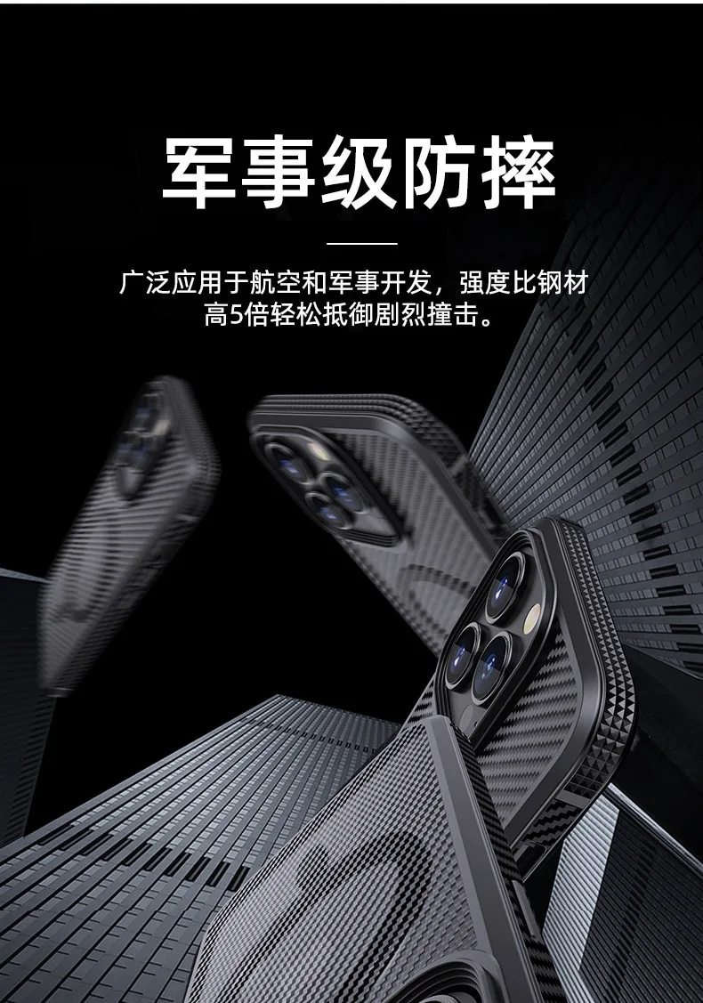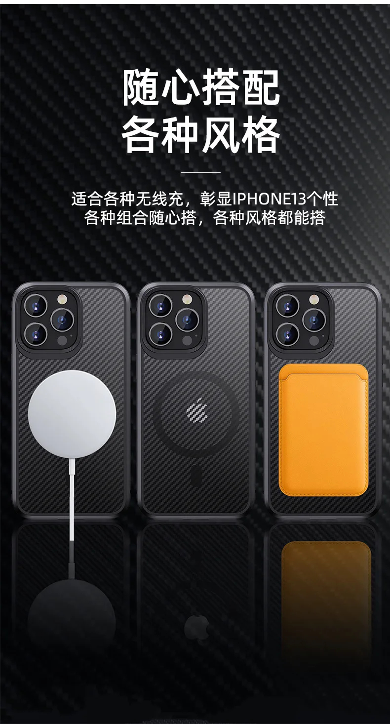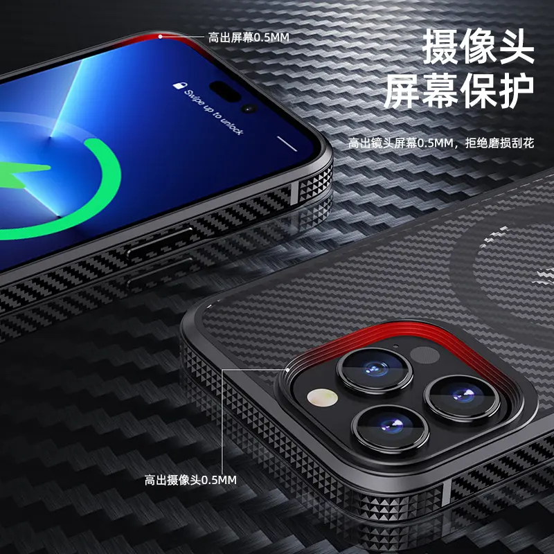 قاب آیفون 15 Pro iPaky MGC از ترکیبی از PC و TPU ساخته شده است و قسمت پشتی آن به صورت نیمه شفاف بوده و دارای بافت فیبر کربنی است. برای محافظت از صفحه نمایش و دوربین لبه های قاب و دور اطراف دوربین به پوششی از جنس TPU مجهز شده اند.