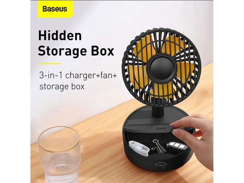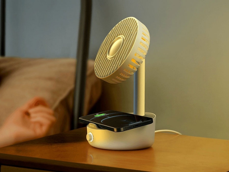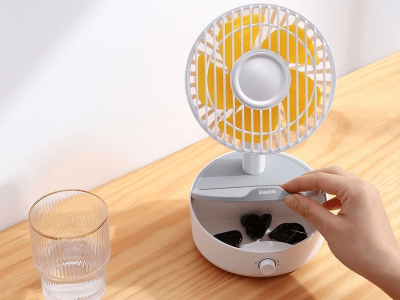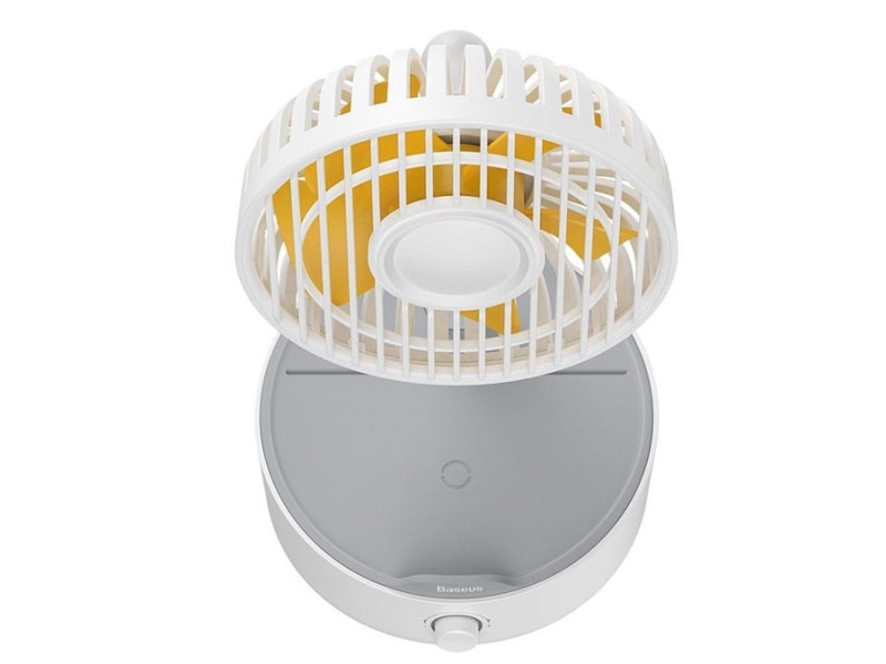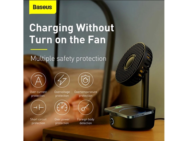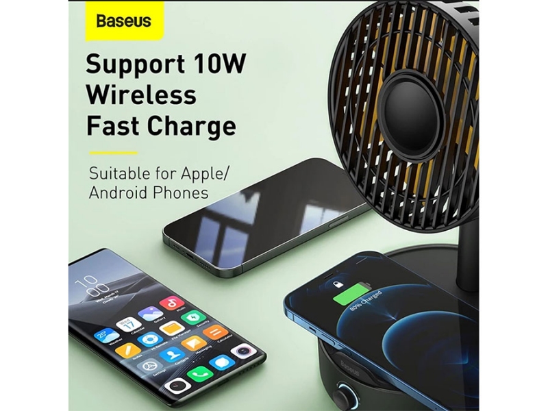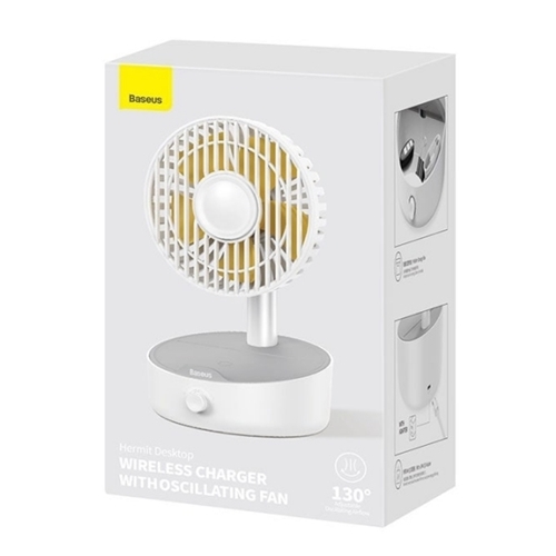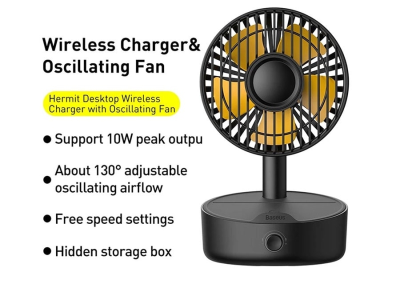 پنکه: شارژر وایرلس فن دار Baseus WXYZ-B01 به شکل یک پنکه رو میزی است که در قسمت پایه پد شارژ وایرلس دارد. این پنکه دارای 5 پره بوده و می‌تواند با زاویه 130 درجه به چپ و راست بچرخد. به علاوه زاویه حرکت آن در راستای بالا به پایین هم 45 درجه است. یک کلید چرخشی در جلوی پایه تعبیه شده که می‌توانید مناسب دل‌خواهتان سرعت فن را با آن کم یا زیاد کنید. توان پنکه 4 وات است.